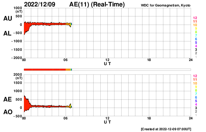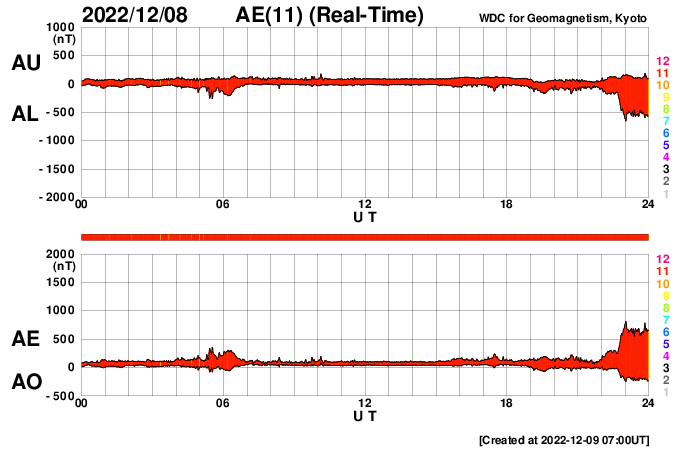 下段のAEグラフの値が高くなると、オーロラ活動が活発化しています。