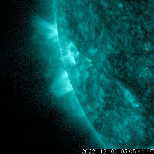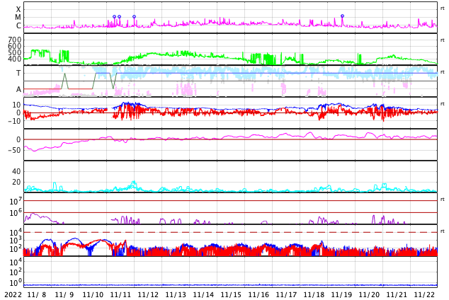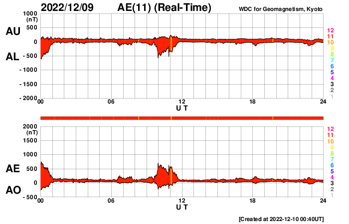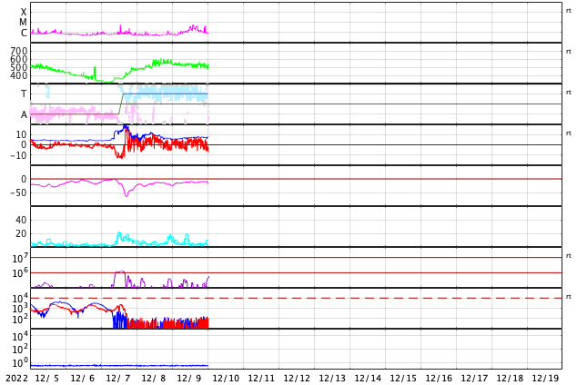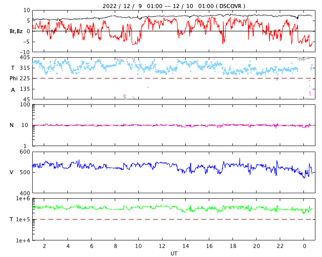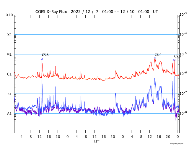 2022/12/10 09:51 更新 Cクラスのフレアが頻繁に発生しています。高速の太陽風が続いています。 担当 篠原 太陽の南東の端(左下)から新しい領域が現れ、 Cクラスの小規模フレアが頻繁に発生する様になっています。 この1日ほどの活動の様子を、 SDO衛星AIA131の動画で紹介します。 規模の大きいものとしては、 9日20時半(世界時9日11時半)のC4.0、 9日23時(世界時9日14時)のC6.0、 10日1時半(世界時9日16時半)のC4.5などがあります。 X線グラフの最後で発生しているC5.0のフレアは、 中心部北側(上)の3157群で発生しています。 この後、活動は強まるでしょうか。 注目して下さい。 太陽風は530km/秒程度の高速の状態が続いていましたが、 グラフの最後で少し下がり、500km/秒を割りかけています。 コロナホールの影響の終わりが近づいているのかもしれません。 磁場強度は、5nTから7nTへ少し上がっています。 磁場の南北成分は、やや北寄りで推移している様です。 磁気圏の活動は全体としては穏やかで、 AE指数は、磁場が一時的に南向きに変化した頃に 600nTの中規模の変化が1回発生した程度で、 その他は変化がありません。 SDO衛星AIA193では、目立つ様なコロナホールはありません。 太陽風は次第に穏やかになりそうです。 ![]() 太陽の南東の端でCクラスのフレアが続いています。 (c) SDO衛星AIA131 (NASA)、(動画加工 : 宇宙天気ニュース) ![]() SDO衛星のAIA193カメラによる太陽コロナの様子 (c) SDO (NASA) ![]() SDO衛星による太陽の可視光写真。マウスの矢印を写真に重ねると、黒点番号付きの写真に切り替わります。 (c) SDO (NASA) ![]() GOES衛星の太陽X線強度。赤・橙 = 0.1〜0.8 nm、青・紫 = 0.05〜0.4 nm (c) データ:NOAA/SWPC、作図:宇宙天気ニュース ![]() DSCOVRが観測した太陽風の磁場(黒線は全体の強度、赤線は南北成分) 磁場の向き、プラズマの密度、速度、温度 (c) データ:NOAA/SWPC、作図:宇宙天気ニュース ![]() AE指数(速報値) 下段のAEグラフの値が高くなると、オーロラ活動が活発化しています。 (c) 京都大学WDC ![]() ![]() 27日の太陽周期に合わせた図 太陽が同じ面を地球に向けていた27日前の変化から、今後を予想することができます。 (c) 作図:宇宙天気ニュース