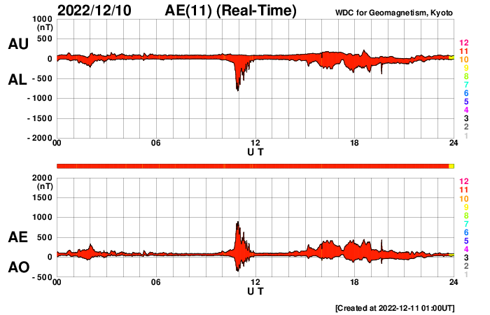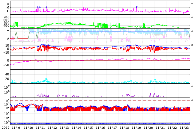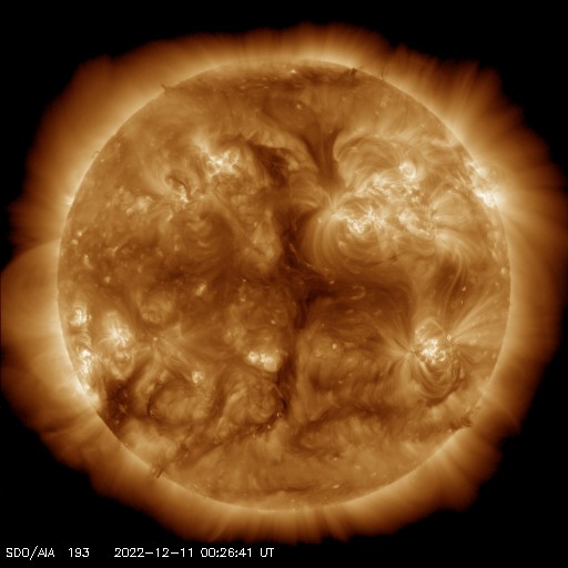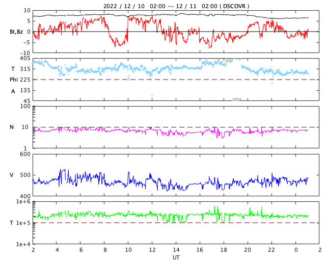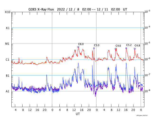 2022/12/11 10:13 更新 太陽でCフレアが続いています。太陽風はやや高速程度に下がっています。 担当 篠原 太陽の南東(左端)でCクラスのフレアを起こしていた領域は、 3163群と番号が付きました。 その後、10日15時半(世界時10日6時半)にC3.9、 10日19時半(世界時10日10時半)にC5.3、 11日1時(世界時10日16時)にC5.2と、 小規模フレアの発生が続いています。 また、中心部北西(右上)の3161群も活動が高まって、 10日19時(世界時10日10時)にC4.6、 今朝、11日5時半(世界時10日20時半)にC4.8と 3163群と同じくらいの規模の小規模フレアを起こしています。 X線グラフは、時間間隔をとりながら、 同じような高さのフレアが次々と発生しています。 この後はどの様に推移するでしょうか。 太陽風は、速度が一段下がり、 460〜480km/秒とやや高速の状態になっています。 磁場強度は8nTと少し強まっていましたが、 グラフの最後で6nTと平均的な値に下がっています。 磁場の南北成分は、ゆっくりと南北に変化していて、 南向きになった頃に、AE指数は小中規模の変化が発生しています。 SDO衛星AIA193の太陽コロナ写真で、 中心部に縦に伸びる薄暗い領域は、 ダークフィラメントではないかと思います。 その場合、この後の太陽風は次第に速度が下がりそうです。 一方、南東の端(左下)の薄暗い領域は、 前周期も見えていたコロナホールです。 前回は太陽風速度の変化は小さかったのですが、 今回はどうなるでしょうか。 ![]() SDO衛星のAIA193カメラによる太陽コロナの様子 (c) SDO (NASA) ![]() SDO衛星による太陽の可視光写真。マウスの矢印を写真に重ねると、黒点番号付きの写真に切り替わります。 (c) SDO (NASA) ![]() GOES衛星の太陽X線強度。赤・橙 = 0.1〜0.8 nm、青・紫 = 0.05〜0.4 nm (c) データ:NOAA/SWPC、作図:宇宙天気ニュース ![]() DSCOVRが観測した太陽風の磁場(黒線は全体の強度、赤線は南北成分) 磁場の向き、プラズマの密度、速度、温度 (c) データ:NOAA/SWPC、作図:宇宙天気ニュース ![]() AE指数(速報値) 下段のAEグラフの値が高くなると、オーロラ活動が活発化しています。 (c) 京都大学WDC ![]() ![]() 27日の太陽周期に合わせた図 太陽が同じ面を地球に向けていた27日前の変化から、今後を予想することができます。 (c) 作図:宇宙天気ニュース