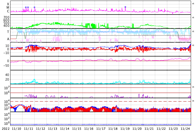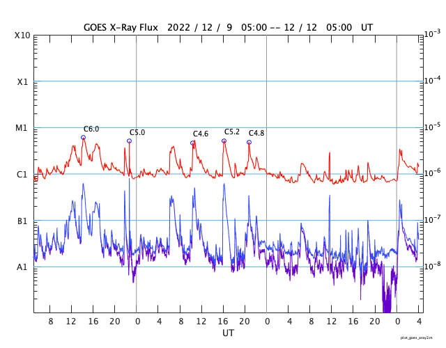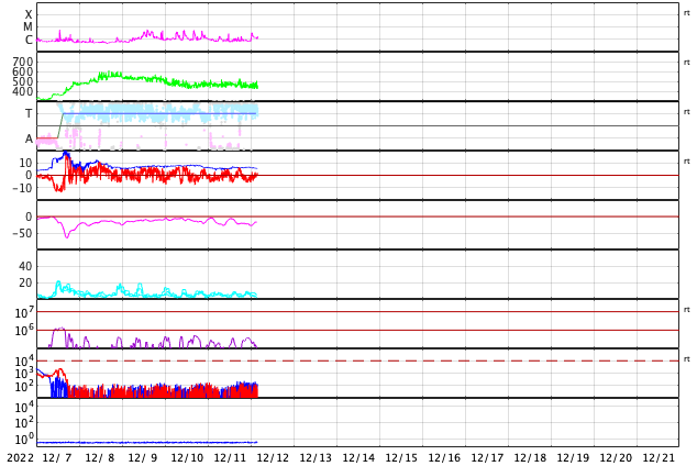 2022/12/11 10:13 太陽でCフレアが続いています。太陽風はやや高速程度に下がっています。