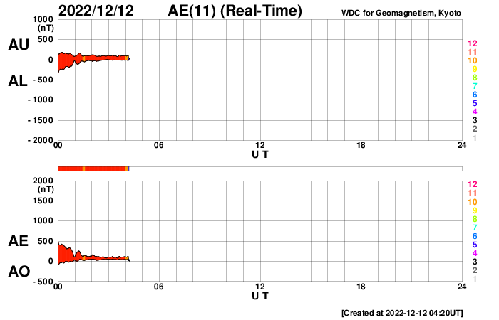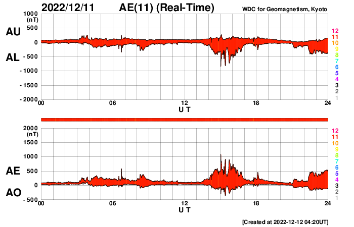 下段のAEグラフの値が高くなると、オーロラ活動が活発化しています。