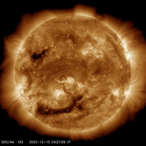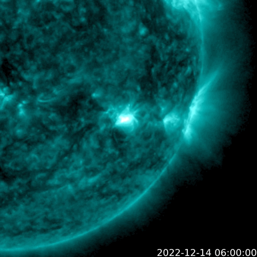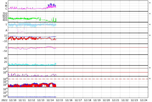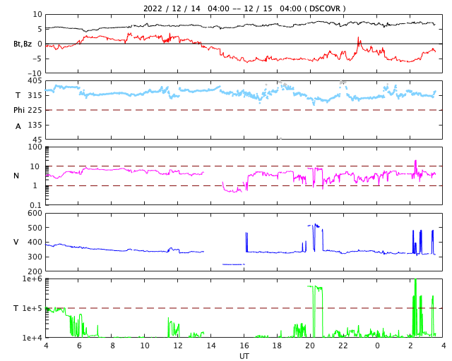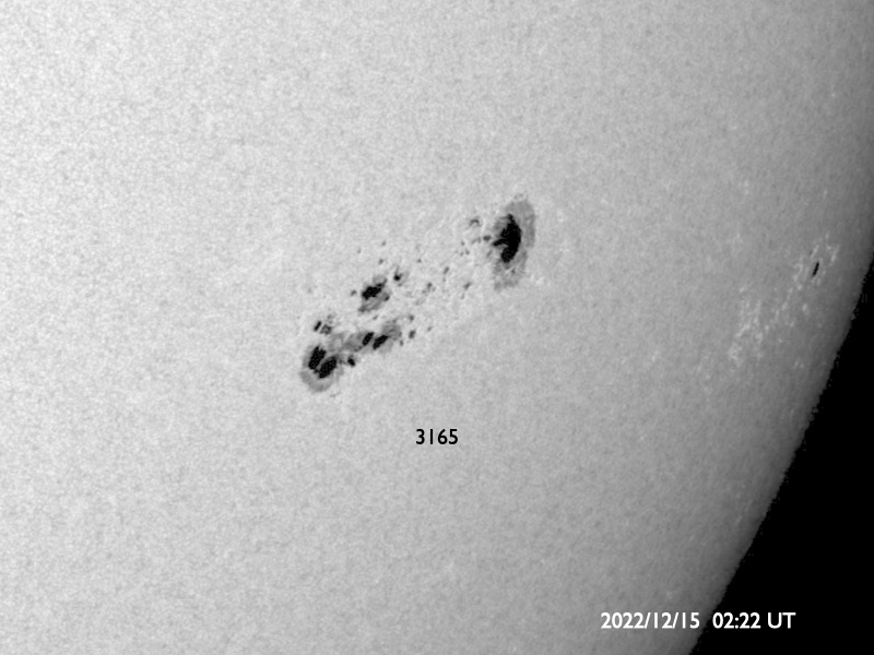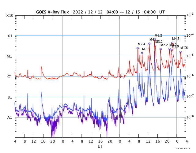 2022/12/15 12:42 更新 Mクラスフレアが13回発生しています。太陽風は低速になっています。 担当 篠原 昨日の夕方から、太陽の南西(右下)の3165黒点群の活動が強まり、 14日16時半(世界時14日7時半)のM2.4の中規模フレアを先頭に、 M1.3、M1.1、M4.1、M6.3、M3.2、M2.2、 M2.2、M1.3、M1.9、M4.5、M1.6と、 今朝にかけて、12個の中規模フレアが次々と発生しています。 X線グラフは、急に激しく変化するようになっています。 SDO衛星の画像ページが不調なので、 GOES衛星SUVI 131の動画を掲載します。 SDO衛星の画像で作る動画よりも枚数が多くなるので、 細かい変化がよく見えますが、 全体がゆっくりに感じられるので注意してください。 発生箇所の3165黒点群は、昨日から形がだいぶ変化しています。 昨日掲載した画像と比べてください。 また、西の端に達した3153群でも M1.1の中規模フレアが発生しています。 この後もフレアは続くのでしょうか。 規模の変化にも注目して下さい。 太陽風は、速度が400km/秒から320km/秒へ下がり、 低速の風に変わっています。 磁場強度は、5nTから7nTへ少し強まっています。 磁場の南北成分は、グラフの中盤から南向きになっています。 速度が下がっているので磁気圏への影響は限定的で、 AE指数は、500nT弱の小規模の変化が起きている程度です。 SDO衛星AIA193を見ると、 南半球で東西にコロナホールが広がっています。 今回もこの領域の影響は来ないのでしょうか。 ![]() 3165黒点群で次々に発生するMクラスフレア。 (c) GOES衛星SUVI 131 (NOAA)、(動画加工 : 宇宙天気ニュース) ![]() 3165黒点群の拡大写真。 (c) SDO衛星 (NASA)、作図:宇宙天気ニュース ![]() SDO衛星のAIA193カメラによる太陽コロナの様子 (c) SDO (NASA) ![]() SDO衛星による太陽の可視光写真。マウスの矢印を写真に重ねると、黒点番号付きの写真に切り替わります。 (c) SDO (NASA) ![]() GOES衛星の太陽X線強度。赤・橙 = 0.1〜0.8 nm、青・紫 = 0.05〜0.4 nm (c) データ:NOAA/SWPC、作図:宇宙天気ニュース ![]() DSCOVRが観測した太陽風の磁場(黒線は全体の強度、赤線は南北成分) 磁場の向き、プラズマの密度、速度、温度 (c) データ:NOAA/SWPC、作図:宇宙天気ニュース ![]() AE指数(速報値) 下段のAEグラフの値が高くなると、オーロラ活動が活発化しています。 (c) 京都大学WDC ![]() ![]() 27日の太陽周期に合わせた図 太陽が同じ面を地球に向けていた27日前の変化から、今後を予想することができます。 (c) 作図:宇宙天気ニュース