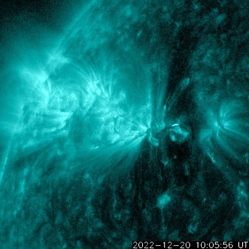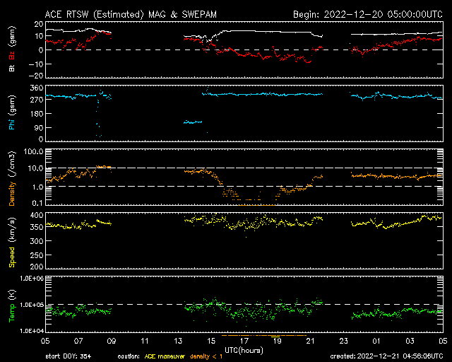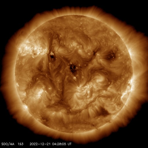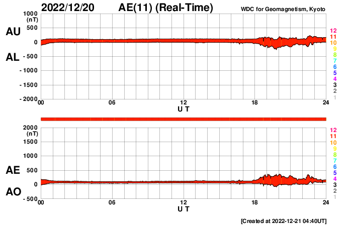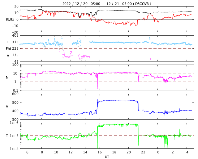 2022/12/21 13:57 更新 太陽風は平均的な速さに戻っています。M1.1の中規模フレアが発生しました。 担当 篠原 太陽風は、350km/秒から400km/秒へ速度が少し上がり、 平均的な速さに戻っています。 磁場強度は、12nT前後と強まった状態が続いています。 磁場の南北成分は、 北寄りからグラフの中盤で南寄りになり、 後半は再び北寄りです。 このため、AE指数も中盤で小規模の変化が発生しています。 全体としては、磁気圏は穏やかです。 27日周期の図を見ると、 前周期の太陽風は、11月25日以降高速の風が続いています。 この高速風が明日くらいから回帰するかもしれません。 一方、SDO衛星AIA193の太陽コロナ写真は、 小さいコロナホールが所々に見えている程度です。 この様子は27日前も同様で、 高速風との対応は良く分かりませんでした。 今回はどの様な変化になるでしょうか。 注目してください。 太陽は、北東(左上)の3169黒点群の活動が続き、 C6.6、C5.0と小規模フレアが起きた後、 昨夜、20日23時(世界時20日14時)に、 M1.1の中規模フレアが発生しています。 SDO衛星AIA131の動画を掲載します。 この後は、活動は穏やかになっていて、 C1〜2の小さい小規模フレアが発生した程度です。 ![]() 3169群で発生したM1.1の中規模フレア。 (c) SDO衛星AIA131 (NASA)、(動画加工 : 宇宙天気ニュース) ![]() SDO衛星のAIA193カメラによる太陽コロナの様子 (c) SDO (NASA) ![]() SDO衛星による太陽の可視光写真。マウスの矢印を写真に重ねると、黒点番号付きの写真に切り替わります。 (c) SDO (NASA) ![]() DSCOVRが観測した太陽風の磁場(黒線は全体の強度、赤線は南北成分) 磁場の向き、プラズマの密度、速度、温度 (c) データ:NOAA/SWPC、作図:宇宙天気ニュース ![]() ACEが観測した太陽風の磁場(1番上の枠、白線は全体の強度、赤線は南北成分) および、太陽風の密度(3番目の橙線)、速度(4番目の黄線) (c) NOAA/SWPC ![]() AE指数(速報値) 下段のAEグラフの値が高くなると、オーロラ活動が活発化しています。 (c) 京都大学WDC ![]() ![]() 27日の太陽周期に合わせた図 太陽が同じ面を地球に向けていた27日前の変化から、今後を予想することができます。 (c) 作図:宇宙天気ニュース