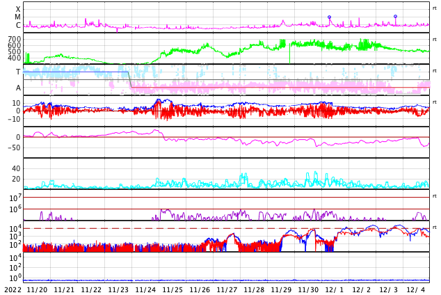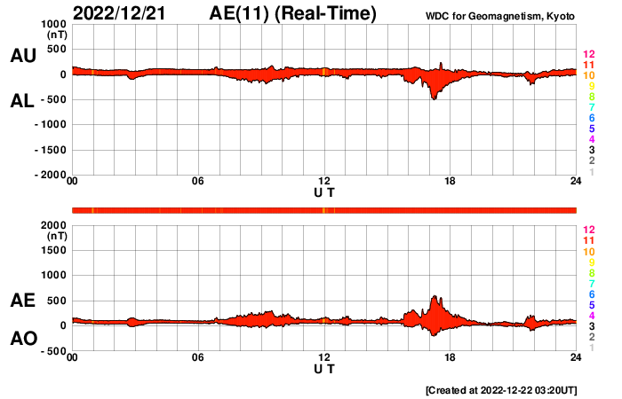 下段のAEグラフの値が高くなると、オーロラ活動が活発化しています。