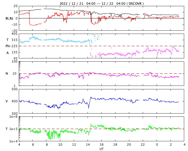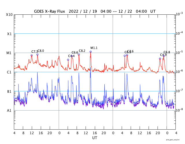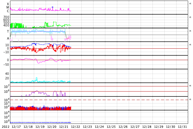 2022/12/21 13:57 太陽風は平均的な速さに戻っています。M1.1の中規模フレアが発生しました。