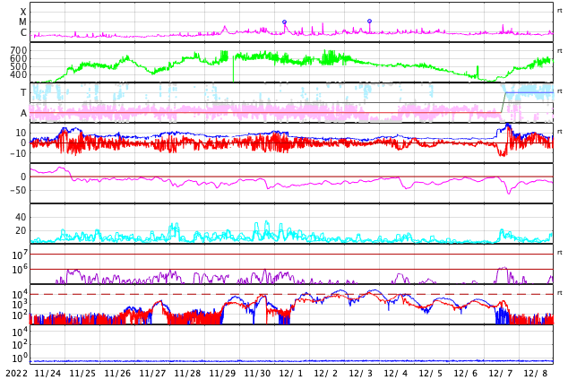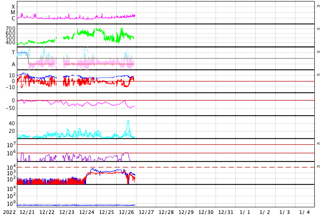 2022/12/23 12:06 太陽風は高速になり、磁気圏の活動も強まっています。