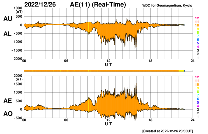 下段のAEグラフの値が高くなると、オーロラ活動が活発化しています。