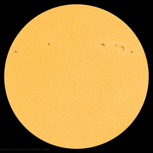 SDO衛星による太陽の可視光写真。マウスの矢印を写真に重ねると、黒点番号付きの写真に切り替わります。