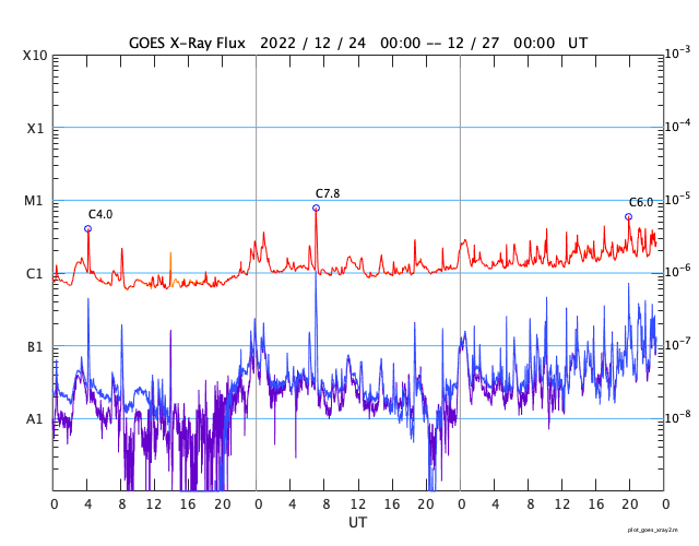 GOES衛星の太陽X線強度。赤・橙 = 0.1〜0.8 nm、青・紫 = 0.05〜0.4 nm