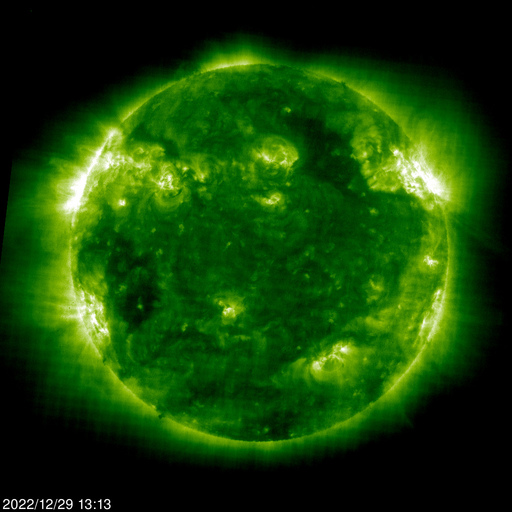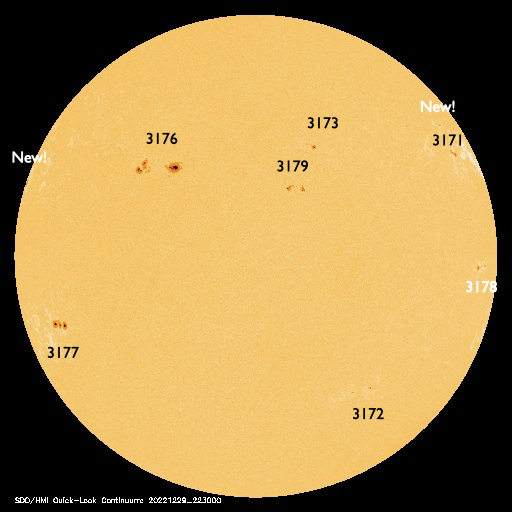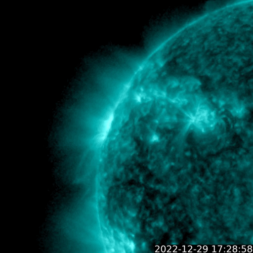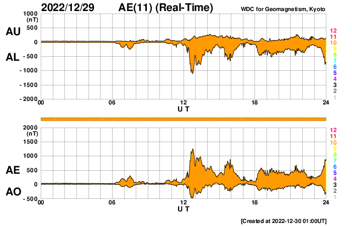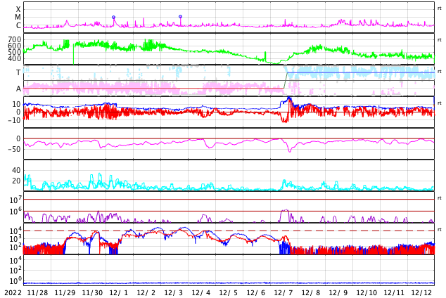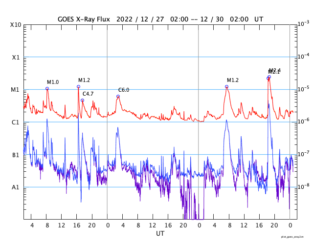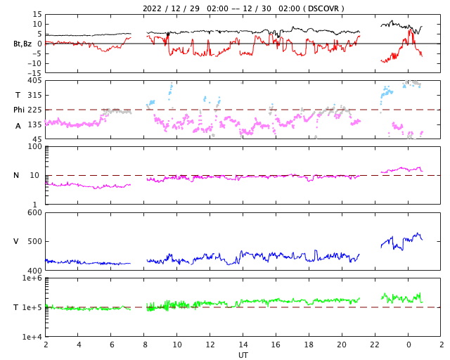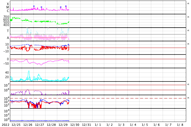 2022/12/30 10:04 更新 Mクラスの中規模フレアが3回発生しました。太陽風は高速になり、磁気圏も活動的です。 担当 篠原 太陽の北東の端(左上)に新しい黒点が現れ、 Mクラスの中規模フレアが3回発生しています。 昨日の午後、29日15時半(世界時29日6時半)のM1.2、 今日未明、30日3時(世界時29日18時)のM2.1、 30日3時半(世界時29日18時半)のM2.4です。 SDO衛星のWebページの更新が停止しているので、 GOES衛星SUVI 131の動画を掲載します。 また、SDO衛星の可視光写真は、 SOHO衛星のWebページから取得しています。 掲載の可視光写真で黒点が見え始めています。 この後どのような活動を起こすか注目して下さい。 太陽風は、420km/秒と平均的な速度でしたが、 今朝くらいから上昇が始まり、 現在は520km/秒と高速の状態に変わっています。 磁場強度は、5nTから6nTに少し上がり、 グラフの後半で10nTに強まって、 以降、5〜10nTの間で変化している様です。 太陽コロナ写真として、 久しぶりにSOHO衛星EIT195を掲載しています。 やや見にくいですが、北西側(右上)にコロナホールがあり、 この領域の影響が始まったのかもしれません。 太陽風磁場の南北成分は、 南北にややゆっくりと変化していて、 -5nTに達する南向きの変化が頻繁に発生しています。 磁気圏の活動は強まっていて、 AE指数は500〜1000nTの中規模の変化が続いています。 ![]() 太陽の北東の端で発生したM2.1、M2.4の中規模フレア。 (c) GOES衛星SUVI 131 (NOAA)、(動画加工 : 宇宙天気ニュース) ![]() SDO衛星による太陽の可視光写真。SOHO衛星のWebページより取得。 (c) SDO衛星HMII (NASA)、作図:宇宙天気ニュース ![]() SOHO衛星EIT195による、太陽コロナの様子。 (c) SOHO衛星EIT 195 (ESA & NASA) ![]() GOES衛星の太陽X線強度。赤・橙 = 0.1〜0.8 nm、青・紫 = 0.05〜0.4 nm (c) データ:NOAA/SWPC、作図:宇宙天気ニュース ![]() DSCOVRが観測した太陽風の磁場(黒線は全体の強度、赤線は南北成分) 磁場の向き、プラズマの密度、速度、温度 (c) データ:NOAA/SWPC、作図:宇宙天気ニュース ![]() AE指数(速報値) 下段のAEグラフの値が高くなると、オーロラ活動が活発化しています。 (c) 京都大学WDC ![]() ![]() 27日の太陽周期に合わせた図 太陽が同じ面を地球に向けていた27日前の変化から、今後を予想することができます。 (c) 作図:宇宙天気ニュース