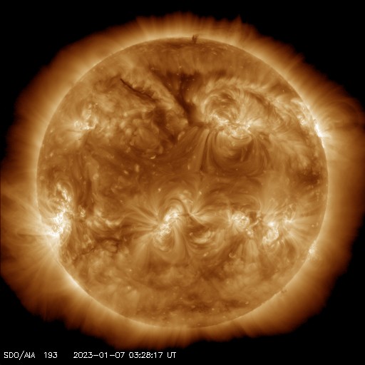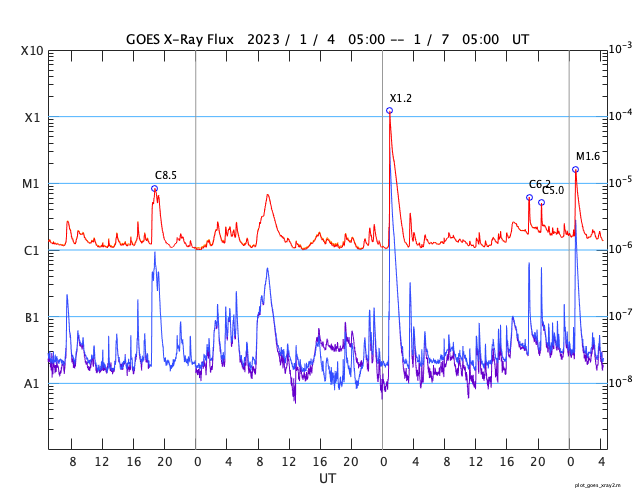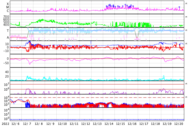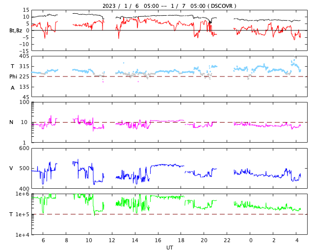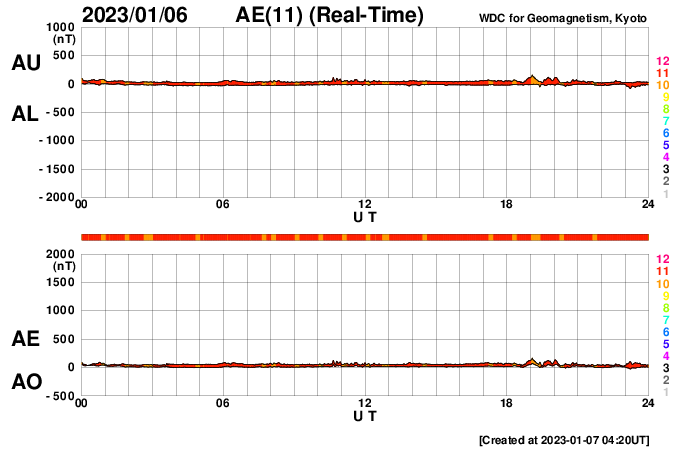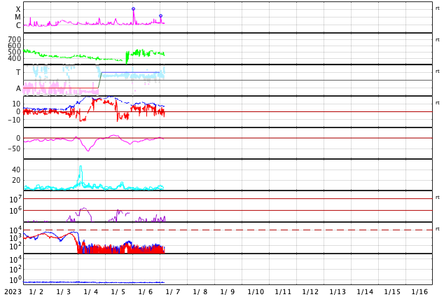 2023/ 1/ 7 13:37 更新 太陽風の速度は下がり、平均的な状態に戻りかけています。 担当 篠原 昨日X1.2のフレアを起こした3182黒点群は、 その後は落ち着いていましたが、 今朝、7日9時半(世界時7日0時半)に M1.6の中規模フレアが発生しました。 この後も活動は続くでしょうか。 また、中心部南西の3183群で、 C6.2、C5.0の小規模フレアが発生していて、 やや活動的な状態です。 太陽風は、速度のグラフが不安定になっていますが、 500km/秒から450km/秒へ次第に低下しているようです。 高速風の領域は終わりそうです。 磁場強度も10nTから7nTへ下がり、 こちらも平均的な状態に戻りかけています。 磁場の南北成分は、 北寄りの傾向から、0nT付近で変化する様になっています。 今のところ磁気圏は穏やかで、 AE指数はほとんど変化のない状態です。 SDO衛星AIA193では、コロナホールは特に見られず、 太陽風は穏やかな状態がしばらく続きそうです。 27日周期の図の前周期も、 12月14日以降は300km/秒台に下がっています。
