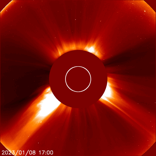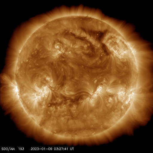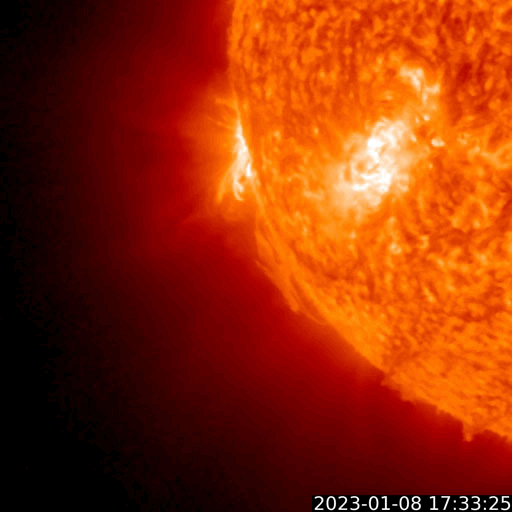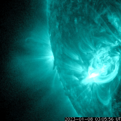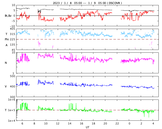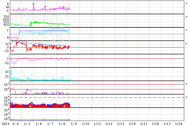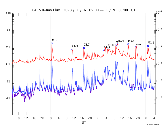 2023/ 1/ 9 13:30 更新 Mクラスのフレアが5回発生しました。太陽風は平均的な状態です。 担当 篠原 昨日のニュースで注目した太陽の南東の端(左下)で、 フレアが活発に発生しています。 昨夕、8日17時半(世界時8日8時半)にM1.2、 8日18時半(世界時8日9時半)にM1.4、 深夜、9日0時(世界時8日15時)にM1.4、 今朝、9日4時(世界時8日19時)にM1.0、 9日10時(世界時9日1時)にM1.1と、 Mクラスの中規模フレアだけでも5回発生しています。 昨日の昼以降の活動の様子を、 SDO衛星AIA131の動画で紹介します。 この領域は現在は太陽のこちら側に回っていて、 現れた黒点には3184群と番号が付けられています。 また、この領域の更に向こう側で別の活動が発生し、 2枚目の動画のGOES衛星SUVI 304によると、 プロミネンス噴出が左下に向かって発生しています。 SOHO衛星LASCO C2、C3では、 CME(コロナ質量放出)が観測されています。 横方向の噴出なので、地球への影響はないでしょう。 太陽のフレアの発生に、引き続き注目してください。 太陽風は、速度が430km/秒から390km/秒へ ゆっくりと低下しています。 磁場強度は、6nTから5nTへ少し下がっている様です。 全体としては平均的な状態ですが、 太陽風は低速風に変わろうとしているのかもしれません。 磁気圏は概ね静穏で、 AE指数は、700nTの中規模の変化が1回発生した程度です。 SDO衛星AIA193では、コロナホールは特に見られず、 太陽風は、穏やかな状態がしばらく続きそうです。 ![]() 南東の3184黒点群の活動の様子。 (c) SDO衛星AIA131 (NASA)、(動画加工 : 宇宙天気ニュース) ![]() 南東の端で発生したプロミネンス噴出。 (c) GOES衛星SUVI 304 (NOAA)、(動画加工 : 宇宙天気ニュース) ![]() 太陽の左下に向かうCME。 (c) SOHO衛星LASCO C2、C3 (ESA & NASA)、(動画加工 : 宇宙天気ニュース) ![]() SDO衛星のAIA193カメラによる太陽コロナの様子 (c) SDO (NASA) ![]() SDO衛星による太陽の可視光写真。マウスの矢印を写真に重ねると、黒点番号付きの写真に切り替わります。 (c) SDO (NASA) ![]() GOES衛星の太陽X線強度。赤・橙 = 0.1〜0.8 nm、青・紫 = 0.05〜0.4 nm (c) データ:NOAA/SWPC、作図:宇宙天気ニュース ![]() DSCOVRが観測した太陽風の磁場(黒線は全体の強度、赤線は南北成分) 磁場の向き、プラズマの密度、速度、温度 (c) データ:NOAA/SWPC、作図:宇宙天気ニュース ![]() AE指数(速報値) 下段のAEグラフの値が高くなると、オーロラ活動が活発化しています。 (c) 京都大学WDC ![]() ![]() 27日の太陽周期に合わせた図 太陽が同じ面を地球に向けていた27日前の変化から、今後を予想することができます。 (c) 作図:宇宙天気ニュース