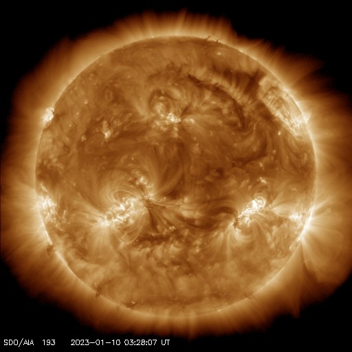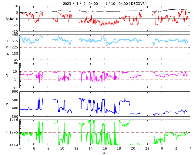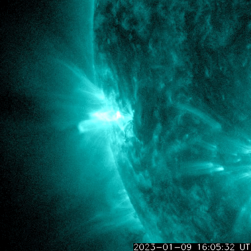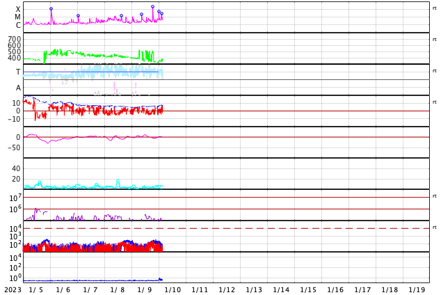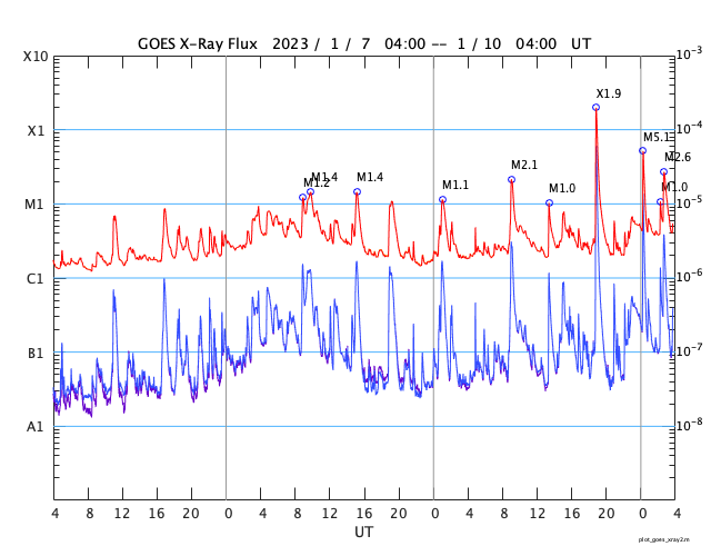 2023/ 1/10 12:57 更新 X1.9の大規模フレアが発生しました。Mクラスのフレアも続いています。 担当 篠原 昨日のニュースで活動が強まっていることをお知らせした 太陽の南東(左下)の3184黒点群で、 今日未明、10日3時半(世界時9日18時半)に、 X1.9の大規模フレアが発生しました。 SDO衛星AIA131の動画を掲載します。 Xフレアの発生は、1月6日のX1.2以来で4日ぶりです。 また、X1.9の規模に達するフレアだと、 昨年の春、2022年4月20日のX2.2以来となり、 およそ9か月ぶりです。 太陽では、北東の端(左上)に新しい領域が現れていて、 動画の後半で、C5.9の小規模フレア、 M5.1の中規模フレアの発生が見えています。 また、南西(右下)の3181群の活動も強まっていて、 昨夕以降、M2.1、M1.0、M2.6と 中規模フレアが続いています。 最後のM2.6は、掲載の動画の最後で見えています。 3181群は、可視光写真の黒点もより大きくなっています。 この後も太陽の活動に注目して下さい。 太陽風は、速度が350km/秒前後に下がり、 低速の風になっています。 磁場強度は、 5nTからグラフの後半で7nTに少し強まっています。 磁気圏は穏やかで、 AE指数は小さい変化が見られる程度です。 SDO衛星AIA193では、コロナホールは特に見られず、 太陽風は、CME(コロナ質量放出)による乱れなどがなければ、 低速の穏やかな状態が続きそうです。 ![]() 南東の3184黒点群で発生したX1.9の大規模フレア。 (c) SDO衛星AIA131 (NASA)、(動画加工 : 宇宙天気ニュース) ![]() SDO衛星のAIA193カメラによる太陽コロナの様子 (c) SDO (NASA) ![]() SDO衛星による太陽の可視光写真。マウスの矢印を写真に重ねると、黒点番号付きの写真に切り替わります。 (c) SDO (NASA) ![]() GOES衛星の太陽X線強度。赤・橙 = 0.1〜0.8 nm、青・紫 = 0.05〜0.4 nm (c) データ:NOAA/SWPC、作図:宇宙天気ニュース ![]() DSCOVRが観測した太陽風の磁場(黒線は全体の強度、赤線は南北成分) 磁場の向き、プラズマの密度、速度、温度 (c) データ:NOAA/SWPC、作図:宇宙天気ニュース ![]() AE指数(速報値) 下段のAEグラフの値が高くなると、オーロラ活動が活発化しています。 (c) 京都大学WDC ![]() ![]() 27日の太陽周期に合わせた図 太陽が同じ面を地球に向けていた27日前の変化から、今後を予想することができます。 (c) 作図:宇宙天気ニュース