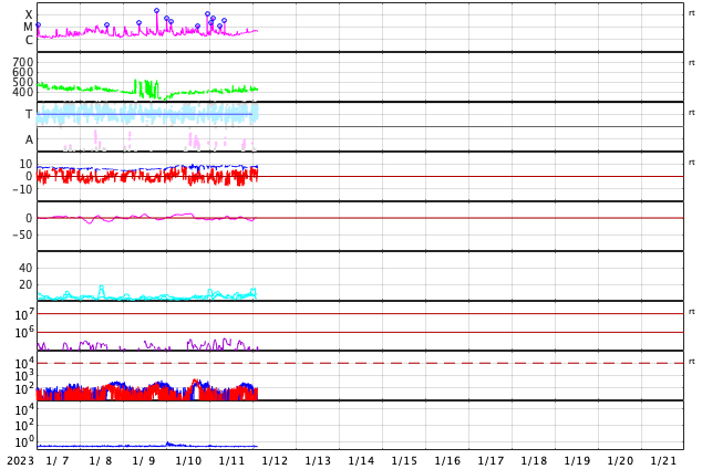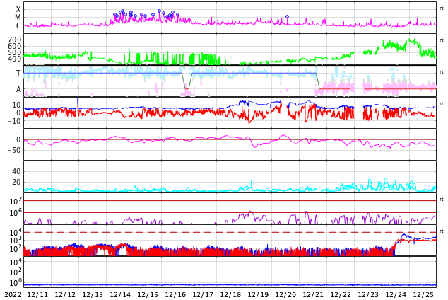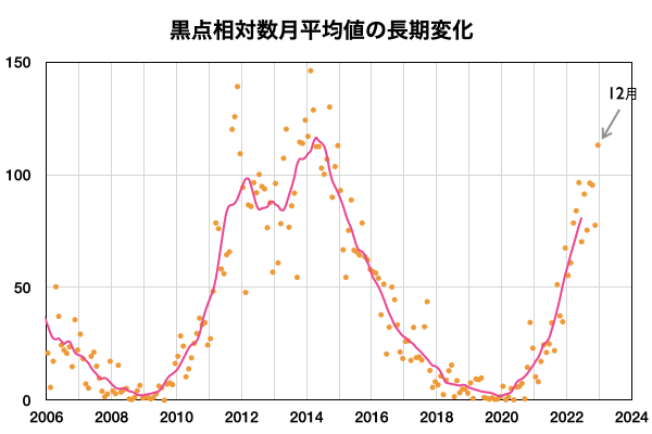2023/ 1/12 12:16 更新 太陽の活動は落ち着いています。12月の黒点相対数は 113.1 でした。 担当 篠原 WDC-SILSOより、2022年12月の黒点相対数は 113.1 と発表されました。 第25活動周期として初めて月平均値が100を超えました。 2019年12月に13か月平均値が極小となってから、 ちょうど3年での達成です。 前の周期である第24期は、2年9か月で100を超えました。 3か月遅れですが、同じくらいと言えそうです。 31日間の可視光写真の動画を掲載します。 31日中22日で黒点相対数の1日値が100を超えました。 掲載の動画でも、常に多くの黒点群が見えている印象です。 (先月の動画と比較して下さい) 第24期の変化を参考にすると、 これから3年くらい、 100付近で上がったり下がったりしそうです。 第24期の最高値は146.1でしたが、 今期はどこまで上がるでしょうか。 太陽は、昨日のニュース以降は、 南西(右下)の3181黒点群でM1.3の中規模フレア、 北東(左上)の3186群でM3.1の中規模フレア、 そして、南東(左下)の3184群でC8.0の小規模フレアと、 あちこちでフレアが発生していますが、 回数は少なくなっています。 一方、SOHO衛星LASCO C2の動画を見ると、 昨夕、11日18時(世界時11日9時)頃に左上へ、 今日未明、12日2時(世界時11日17時)頃に左下へ、 それぞれ太陽の向こう側で発生した現象による CME(コロナ質量放出)が発生しています。 太陽風は、速度が400km/秒から420km/秒に少し上がっていますが、 平均的な状態です。 磁場強度は、8〜9nTと少し強まった状態です。 磁場の南北成分は、 南寄りになったり、北寄りになったり、 ゆっくり変化しています。 南寄りになった時に磁気圏の活動も少し強まって、 AE指数で200〜300nTの小規模の変化が発生しています。