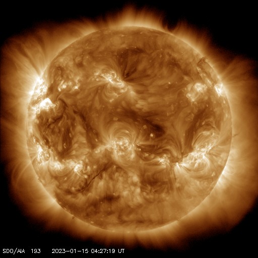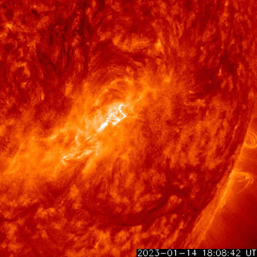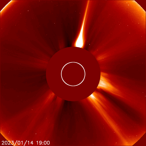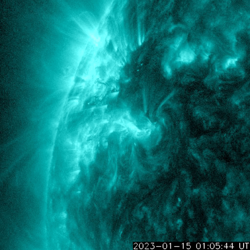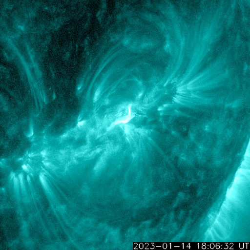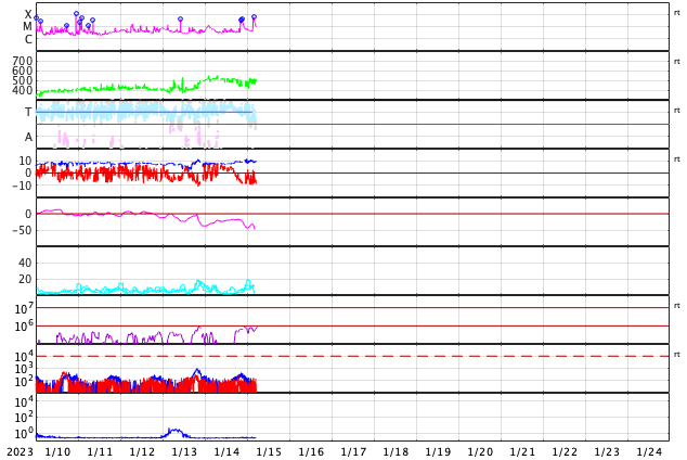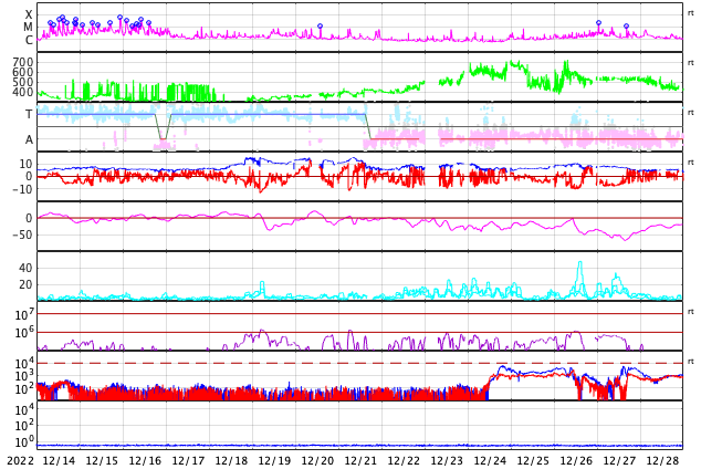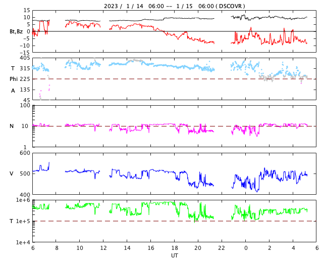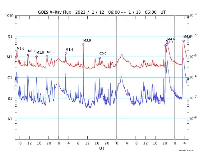 2023/ 1/15 14:30 更新 Mクラスの中規模フレアが続いています。太陽風はやや高速の状態です。 担当 篠原 今朝、15日5時と5時半(世界時14日20時と20時半)に、 太陽の南西(右下)の3182黒点群で、 M3.5とM4.6の中規模フレアが発生しました。 SDO衛星AIA131の動画では、 一連の活動の中で明るい輝きが2回発生しています。 SDO衛星AIA304では、 フレアの発生に伴って、 右方向にコロナのガスの黒い筋が飛び出しているのが見えます。 この噴出はCME(コロナ質量放出)となっていて、 SOHO衛星LASCO C2、C3では、 太陽の右寄りにガスが飛び出しているのが分かります。 地球に対しては斜め方向の噴出ですが、 3日後くらいの太陽風に影響が見られるかもしれません。 噴出の端の方にあたるので、 比較的小さい変化に留まるのではないでしょうか。 そして、15日12時(世界時15日3時)には、 太陽の北東(左上)の3191黒点群で、 M6.0の中規模フレアが発生しています。 SDO衛星AIA131の動画を掲載します。 このフレアも輝きが長い時間続くタイプで、 CMEも発生している可能性があります。 この後のSOHO衛星の画像に注目して下さい。 3191群はこれから太陽の中心に近付くので、 活動が続く様だとより注意が必要になるでしょう。 太陽風は、速度のデータが見にくくなっていますが、 510km/秒から450km/秒程度へ一旦下がり、 再び500km/秒近くへ高まっている様です。 やや高速くらいで推移している様です。 磁場強度は、8nTから10nTへ強まっています。 南北成分は、グラフの中程から南向きに強まる様になり、 -5nTを超えるくらいになっています。 磁気圏の活動は、今のところやや強まっている程度で、 AE指数は500nTくらいの中規模の変化が 連続して発生しています。 この後はどのくらいの活動になるでしょうか。 太陽風速度の変化や、 磁場の南向きの様子に注目してください。 ![]() 3182黒点群で発生した、M3.5、M4.6の中規模フレア。 (c) SDO衛星AIA131 (NASA)、(動画加工 : 宇宙天気ニュース) ![]() AIA304では、コロナのガスが飛び出す様子が見えています。 (c) SDO衛星AIA304、(動画加工 : 宇宙天気ニュース) ![]() 太陽の右寄りに噴出するCME。 (c) SOHO衛星LASCO C2、C3 (ESA & NASA)、(動画加工 : 宇宙天気ニュース) ![]() 3191黒点群で発生した、M6.0の中規模フレア。 (c) SDO衛星AIA131 (NASA)、(動画加工 : 宇宙天気ニュース) ![]() SDO衛星のAIA193カメラによる太陽コロナの様子 (c) SDO (NASA) ![]() SDO衛星による太陽の可視光写真。マウスの矢印を写真に重ねると、黒点番号付きの写真に切り替わります。 (c) SDO (NASA) ![]() GOES衛星の太陽X線強度。赤・橙 = 0.1〜0.8 nm、青・紫 = 0.05〜0.4 nm (c) データ:NOAA/SWPC、作図:宇宙天気ニュース ![]() DSCOVRが観測した太陽風の磁場(黒線は全体の強度、赤線は南北成分) 磁場の向き、プラズマの密度、速度、温度 (c) データ:NOAA/SWPC、作図:宇宙天気ニュース ![]() AE指数(速報値) 下段のAEグラフの値が高くなると、オーロラ活動が活発化しています。 (c) 京都大学WDC ![]() ![]() 27日の太陽周期に合わせた図 太陽が同じ面を地球に向けていた27日前の変化から、今後を予想することができます。 (c) 作図:宇宙天気ニュース