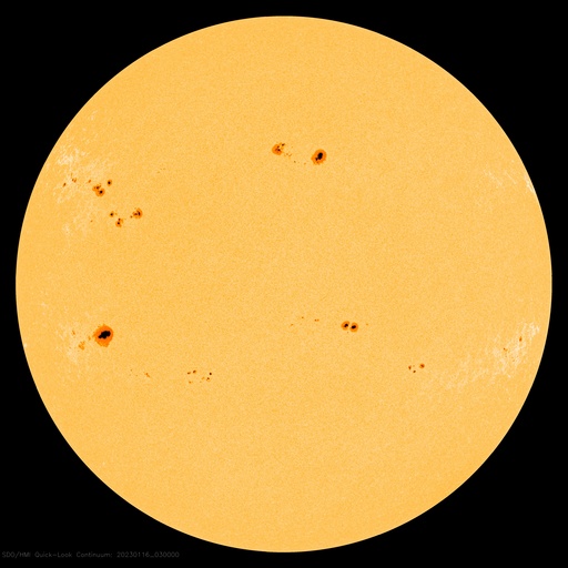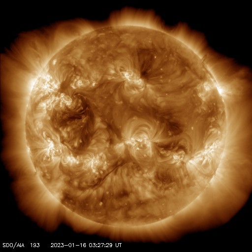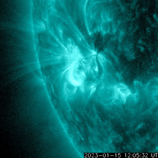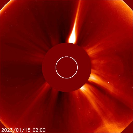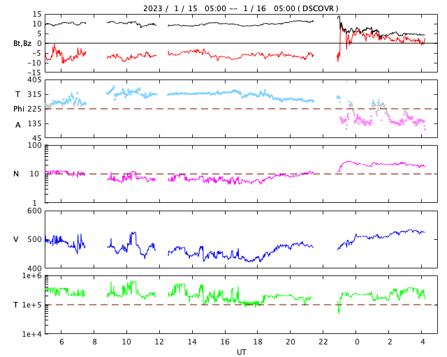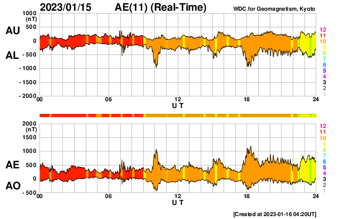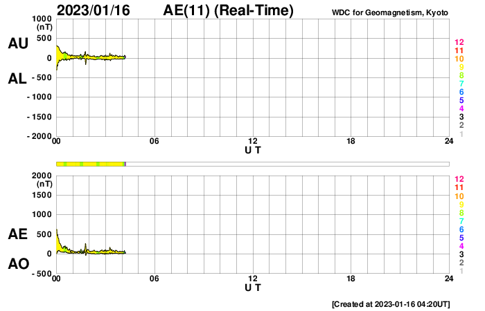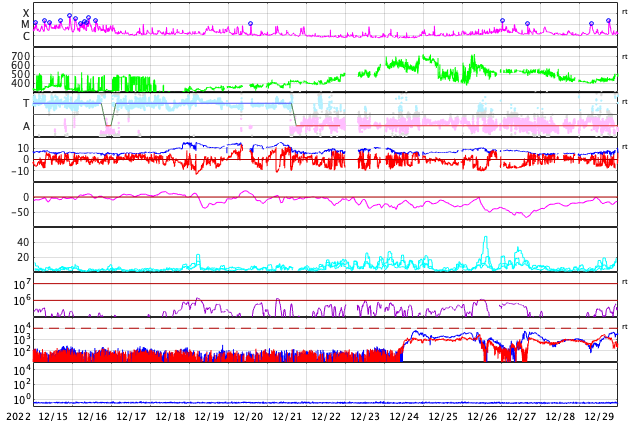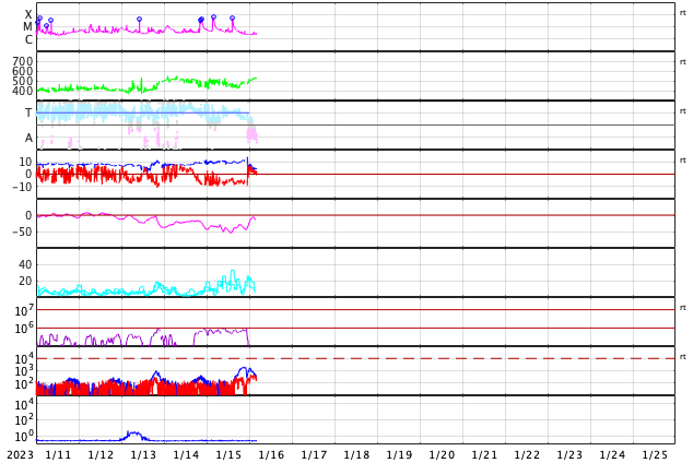 2023/ 1/16 13:23 更新 M4.8の中規模フレアが発生しました。太陽風は高速の状態です。 担当 篠原 昨日のニュースで紹介した、 太陽の北東(左上)の3191黒点群で発生した M6.0の中規模フレアに伴うCME(コロナ質量放出)の様子を、 SOHO衛星LASCO C2、C3の動画で紹介します。 動画では、コロナのガスは左下に向かって飛び出しています。 地球に対して横向きに近いので、影響はないでしょう。 太陽では、昨夜遅く、15日23時(世界時15日14時)にも M4.8の中規模フレアが発生しています。 太陽の南東(左下)の1390黒点群です。 SDO衛星AIA131の動画を掲載します。 この後は、3182群でC4.1、1390群でC4.8の 小規模フレアが発生した程度で、変化は落ち着いています。 太陽風は、500km/秒から今日未明に430km/秒へ下がり、 その後上昇して、現在は530km/秒と高速の状態に戻っています。 磁場強度は、10nTと強まった状態から、 グラフの後半で5nTと平均的な値に下がっています。 磁場が強まっている間、 南北成分は-5〜-10nTと南向きに振れ続け、 磁気圏の活動を強めました。 AE指数は500〜1000nTの中規模の変化が 連続して発生しています。 グラフの最後で磁場が北向きに切り替わり、 AE指数も最後は穏やかになっています。