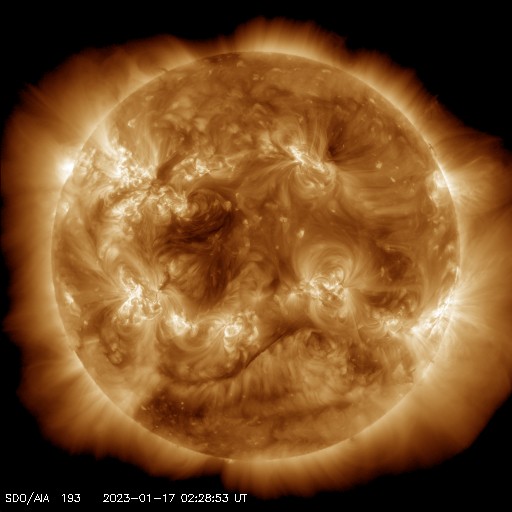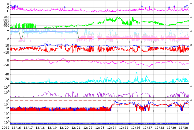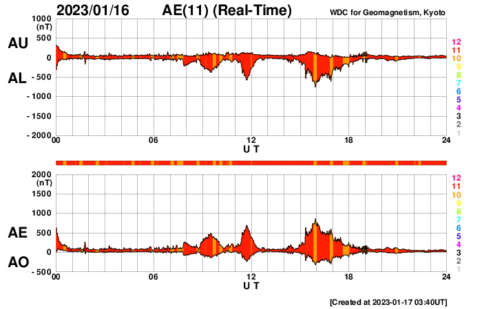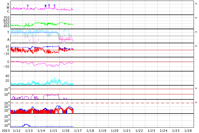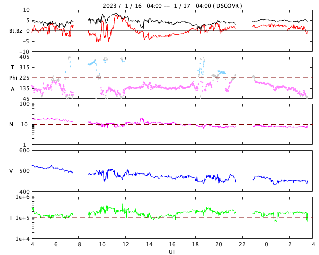 2023/ 1/17 12:45 更新 太陽風は平均的な状態になり、磁気圏も穏やかです。 担当 篠原 太陽風の速度は530km/秒から450km/秒へゆっくりと下がり、 平均的な状態に戻っています。 磁場強度も5nTと平均的な状態で推移しています。 磁場の南北成分は、南北にゆっくりと変化していて、 南向きになった頃に、 AE指数で700nTの中規模の変化が発生しています。 現在は北寄りで推移しているので磁気圏は穏やかで、 AE指数はほとんど変化がありません。 SDO衛星AIA193の太陽コロナ写真では、 コロナホールは特に見られませんが、 27日周期の図を見ると、 前周期の太陽風は12月23日から速度が高まっています。 明後日以降、太陽風の速度が高まるか、 穏やかに推移するか注目してください。 太陽は、南西(右下)の3182黒点群でC8.7、 北東(左上)の3192群でC9.4など、 Cクラスの小規模フレアがあちこちで発生しています。 この後、活動の規模が大きくなる領域はあるでしょうか。