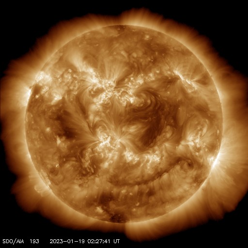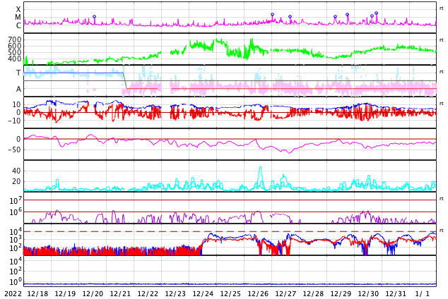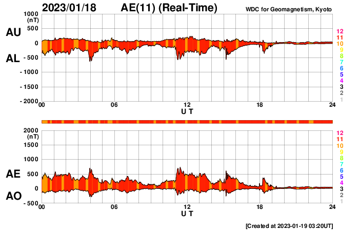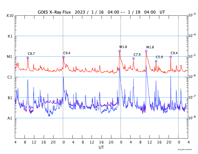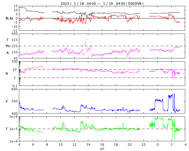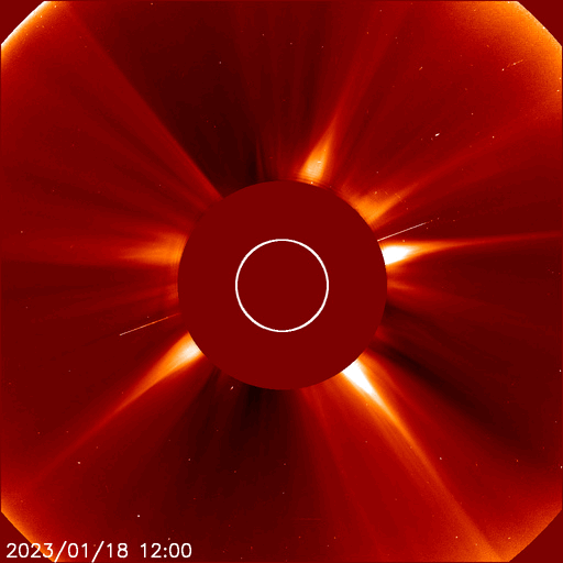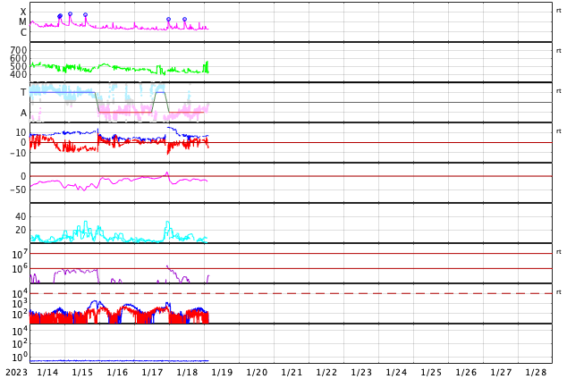 2023/ 1/19 12:22 更新 CMEが発生しています。太陽風は平均的な速度が続いています。 担当 篠原 太陽で、昨夜遅く、18日23時(世界時18日14時)と、 今朝早く、19日4時(世界時18日19時)に、 太陽の南西(右下)と南東(左下)へ向かって CME(コロナ質量放出)が発生しています。 SOHO衛星LASCO C2、C3の動画を掲載します。 右下のCMEはガスの広がり方が大きく、 太陽の中心に少し近い領域で発生した様に見えますが、 SDO衛星では対応する変化が見つけられず、 太陽の向こう側で発生した現象の様に思います。 左下のCMEは太陽の端で発生していて、 CMEは横に向かって飛び出しています。 地球への影響はないでしょう。 フレアは、昨夜、18日19時半(世界時18日10時半)に 中心部南側の3190群でM1.8の中規模フレアが発生し、 その他に、北西(右上)の3186群でC5.9、 中心部北側の3192群でC9.4などの 小規模フレアが発生しています。 全体としてはやや活動的な状態で、 引き続き注目してください。 太陽風は、速度のグラフがやや不安定になっていますが、 430km/秒前後の平均的な速さで推移している様です。 磁場強度は7nTへ下がり、安定しています。 磁場の南北成分は、南寄りから北寄りに変化しています。 このため、AE指数も途中までは小規模の変化が続いていますが、 後半は静かになっています。 しかし、太陽風のグラフの最後で、 磁場は南向きになっています。 この傾向が続く場合は、 再び磁気圏で小規模の活動が見られる様になるでしょう。 ![]() 太陽の南西と南東にCMEが飛び出しています。 (c) SOHO衛星LASCO C2、C3 (ESA & NASA)、(動画加工 : 宇宙天気ニュース) ![]() SDO衛星のAIA193カメラによる太陽コロナの様子 (c) SDO (NASA) ![]() SDO衛星による太陽の可視光写真。マウスの矢印を写真に重ねると、黒点番号付きの写真に切り替わります。 (c) SDO (NASA) ![]() GOES衛星の太陽X線強度。赤・橙 = 0.1〜0.8 nm、青・紫 = 0.05〜0.4 nm (c) データ:NOAA/SWPC、作図:宇宙天気ニュース ![]() DSCOVRが観測した太陽風の磁場(黒線は全体の強度、赤線は南北成分) 磁場の向き、プラズマの密度、速度、温度 (c) データ:NOAA/SWPC、作図:宇宙天気ニュース ![]() AE指数(速報値) 下段のAEグラフの値が高くなると、オーロラ活動が活発化しています。 (c) 京都大学WDC ![]() ![]() 27日の太陽周期に合わせた図 太陽が同じ面を地球に向けていた27日前の変化から、今後を予想することができます。 (c) 作図:宇宙天気ニュース