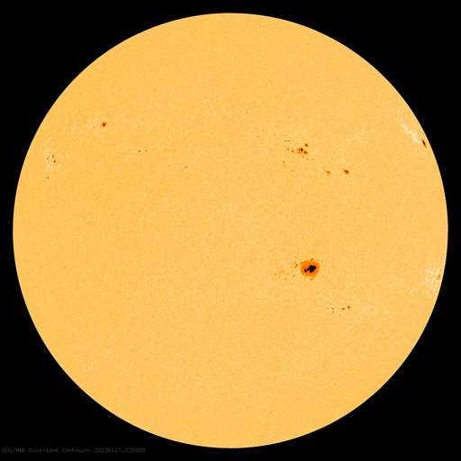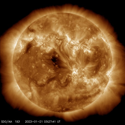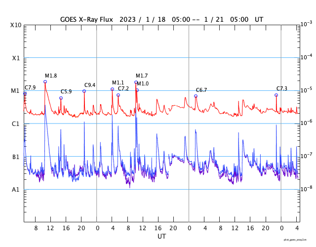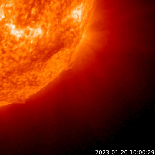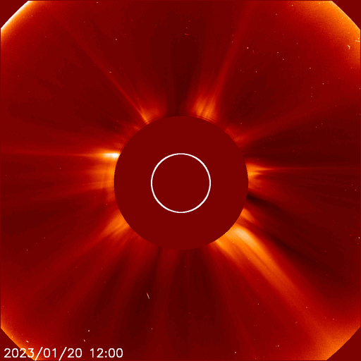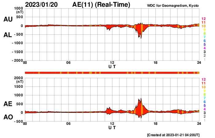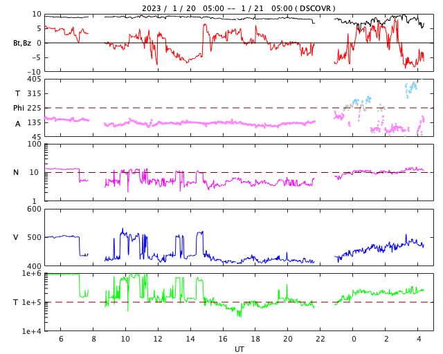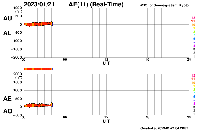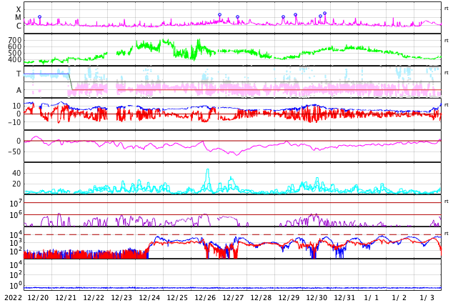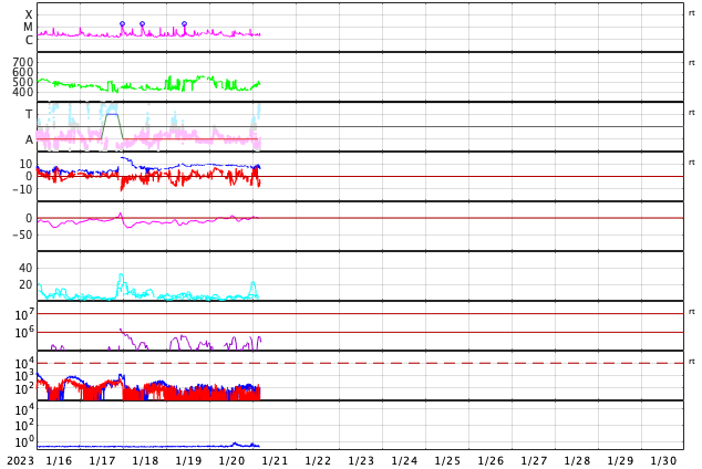 2023/ 1/21 13:31 更新 太陽の右下でCMEが発生しています。太陽風の速度が少し高まっている様です。 担当 篠原 太陽の南西側(右下)で、 昨夜、20日20時(世界時20日11時)頃に フィラメント噴出が発生しました。 GOES衛星SUVI 304の動画を掲載します。 太陽から右下に向かって、 コロナのガスが大きく飛び出しています。 SOHO衛星LASCO C2、C3では、 CME(コロナ質量放出)が観測されています。 動画を見ると、地球に対して横向きに飛び出している様で、 地球への影響は到来しても小さそうです。 フレアの発生は少なくなっていて、 3192群でC7.3、3190群でC5.3などの小規模フレアが 発生している程度です。 太陽風は、400km/秒と平均的な速度が続いていますが、 グラフの最後で480km/秒へ上昇しています。 磁場強度は、8nT前後と少し強まった状態です。 磁気圏は全体としては穏やかな状態で、 AE指数は一時的に700nTの中規模の変化が発生した程度で、 その他は変化が小さくなっています。 27日周期の図を見ると、 前周期の太陽風も速度が高まる変化が発生していました。 その変化が回帰しているのかもしれません。 この後の変化に注目してください。