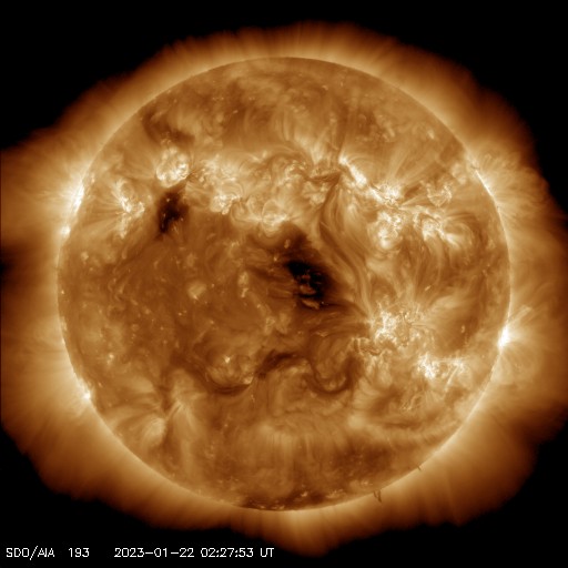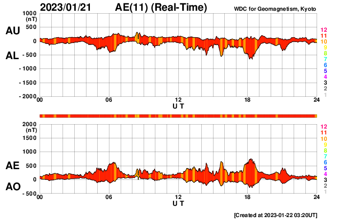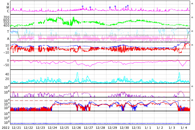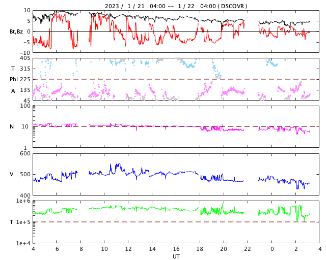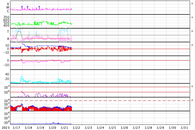 2023/ 1/22 12:21 更新 太陽風速度の高まりは終わりかけています。太陽は次第に穏やかになっています。 担当 篠原 太陽風の速度は、 今日未明まで500km/秒前後と高速の状態でしたが、 そこから低下して、現在は460km/秒と、 平均的な速さに戻りかけています。 磁場強度もグラフの後半は5nTと平均的な状態です。 27日周期の図を見ると、 前周期の太陽風はこの後も 1月2日にかけて速度の高まりが続いています。 今回はどの様に推移するでしょうか。 太陽風磁場の南北成分は、 グラフの途中まで南寄りの変化が続き、 AE指数も300〜700nT程度の小中規模の変化が続いていました。 しかし、その後磁場は0nT付近で変化する様になり、 AE指数も現在は変化が見られなくなっています。 太陽は、北西(右上)の3192黒点群で、C5.0、C7.0、 南西(右下)の3194群でC5.6が2回、 などの小規模フレアが発生しています。 しかし、X線グラフの変化は少なくなっていて、 全体としては次第に穏やかになっています。