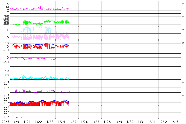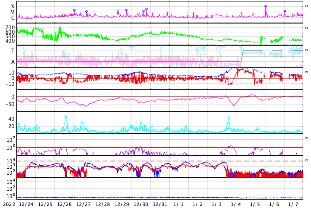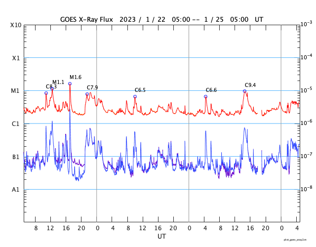 GOES衛星の太陽X線強度。赤・橙 = 0.1〜0.8 nm、青・紫 = 0.05〜0.4 nm (c) データ:NOAA/SWPC、作図:宇宙天気ニュース ![]() | ||||||||||||||||||||||||||||||||||||||||||||||||||||||||||||||||||||||||||||||||||||||||||||||||||||||||||||||||||||||||||||||||||||||||||||||||||||||||||||||||||||||||||||||||||||||||||||||||||||||||||||||||||||||||||||||||||||||||||||||||||||||||||||||||||||||||||||||||||||||||||||||||||||
