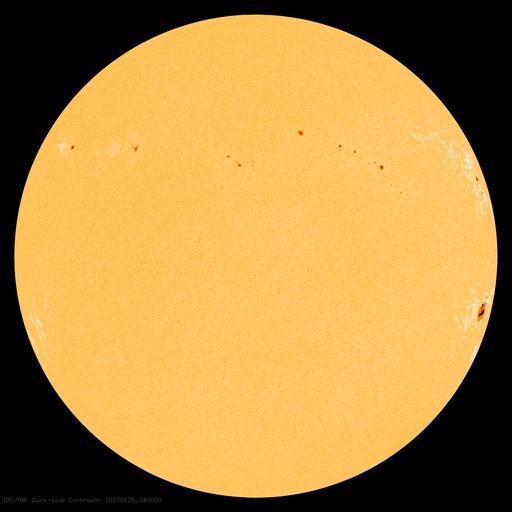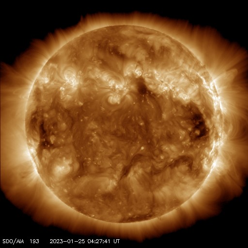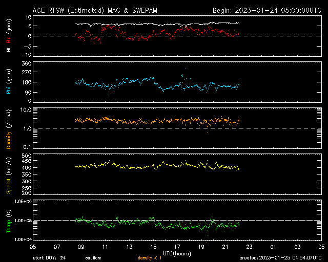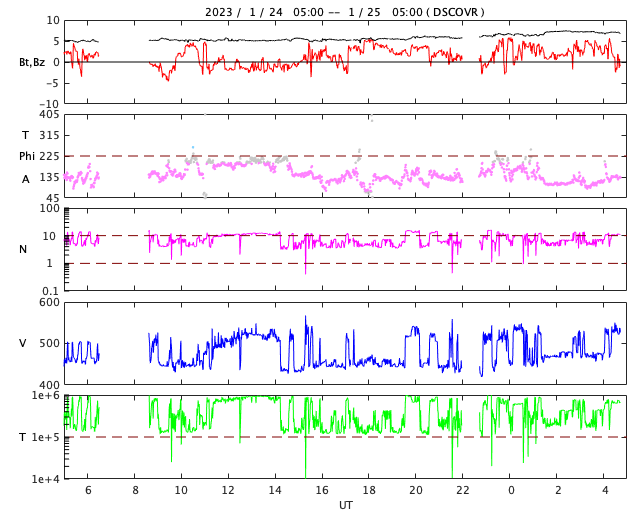 2023/ 1/25 13:54 更新 太陽風は平均的な状態で、磁気圏は穏やかです。 担当 篠原 太陽風は、DSCOVR衛星のデータがやや不安定になっていますが、 450km/秒前後で推移している様です。 参考にACE衛星を見ると、こちらは400km/秒付近です。 多少の違いはありますが、 概ね平均的な速度で安定している様です。 磁場強度は5〜6nTとこちらも平均的な状態です。 磁場の南北成分は、0nT付近から、 グラフの後半は弱い北寄りになっています。 磁気圏は穏やかで、AE指数はほとんど変化のない状態です。 SDO衛星AIA193では、 太陽の中心部にコロナホールは見られず、 太陽風は穏やかに推移しそうです。 一方、27日周期の図を見ると、 前周期の太陽風は、12月30日から速度の高まりが発生していました。 この変化が回帰するのであれば明日くらいになりそうですが、 どの様に推移するでしょうか 太陽は、北東の端(左上)近くの3192黒点群で、 C9.4と大きめの小規模フレアが発生しています。 この3192群や、南西の端(右下)の3190群、3194群は もうすぐ太陽の向こう側に回ってしまいます。 この後、太陽は一旦穏やかになりそうです。 ![]() SDO衛星のAIA193カメラによる太陽コロナの様子 (c) SDO (NASA) ![]() SDO衛星による太陽の可視光写真。マウスの矢印を写真に重ねると、黒点番号付きの写真に切り替わります。 (c) SDO (NASA) ![]() DSCOVRが観測した太陽風の磁場(黒線は全体の強度、赤線は南北成分) 磁場の向き、プラズマの密度、速度、温度 (c) データ:NOAA/SWPC、作図:宇宙天気ニュース ![]() ACEが観測した太陽風の磁場(1番上の枠、白線は全体の強度、赤線は南北成分) および、太陽風の密度(3番目の橙線)、速度(4番目の黄線) (c) NOAA/SWPC ![]() AE指数(速報値) 下段のAEグラフの値が高くなると、オーロラ活動が活発化しています。 (c) 京都大学WDC ![]() ![]() 27日の太陽周期に合わせた図 太陽が同じ面を地球に向けていた27日前の変化から、今後を予想することができます。 (c) 作図:宇宙天気ニュース