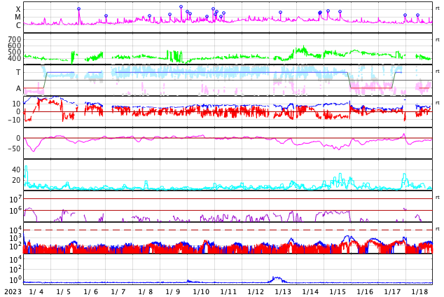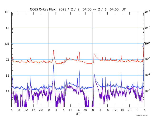 GOES衛星の太陽X線強度。赤・橙 = 0.1〜0.8 nm、青・紫 = 0.05〜0.4 nm (c) データ:NOAA/SWPC、作図:宇宙天気ニュース ![]() | ||||||||||||||||||||||||||||||||||||||||||||||||||||||||||||||||||||||||||||||||||||||||||||||||||||||||||||||||||||||||||||||||||||||||||||||||||||||||||||||||||||||||||||||||||||||||||||||||||||||||||||||||||||||||||||||||||