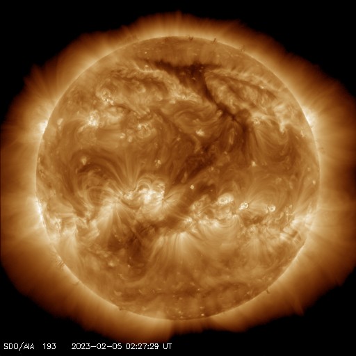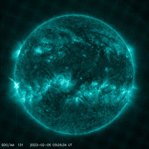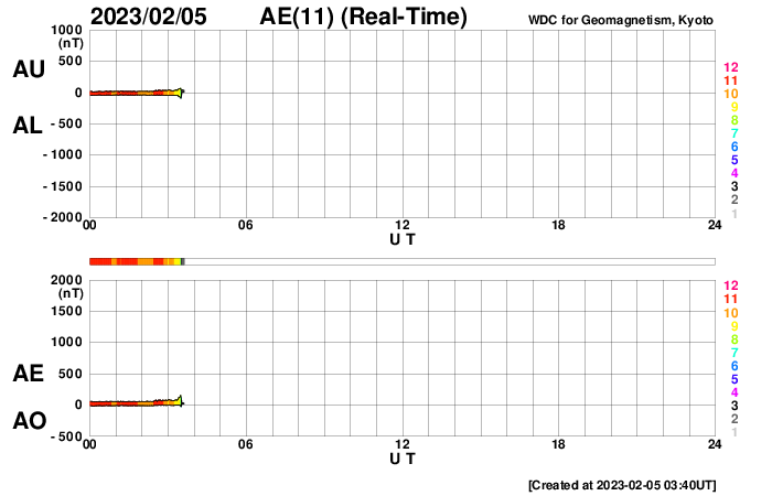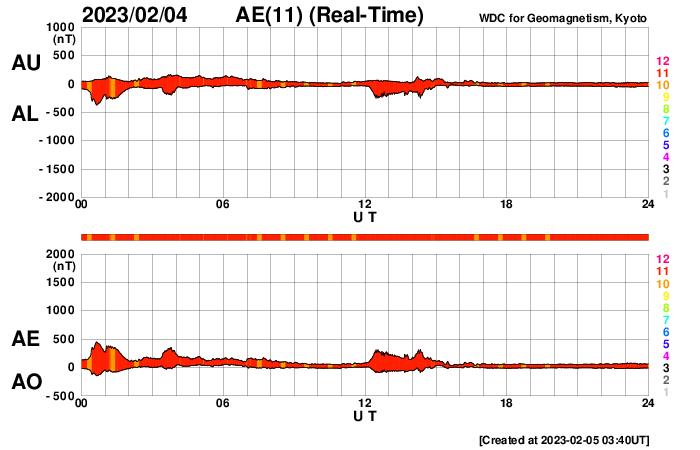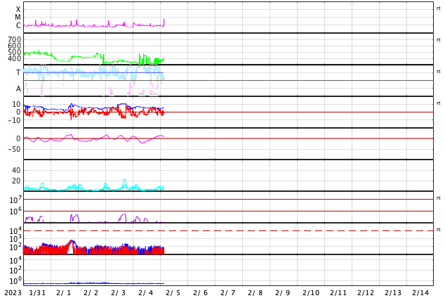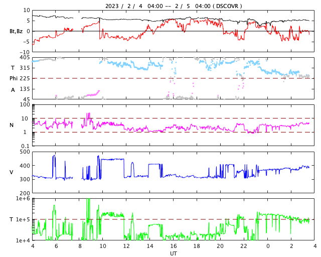 2023/ 2/ 5 12:48 更新 太陽風は平均的な速度になっています。C6.6の小規模フレアが発生しました。 担当 篠原 太陽風は、310km/秒の低速の状態が続いていましたが、 グラフの最後で400km/秒と平均的な速さに上がっています。 磁場強度は5nTと平均的な状態で安定しています。 このため、速度が更に高まることはなさそうに思います。 このまま平均的な状態が続くのか、 しばらく注目して下さい。 磁気圏は穏やかで、 AE指数は小規模の変化が起きている程度です。 SDO衛星AI)A193では、コロナホールは見られず、 太陽風は穏やかな状態が続きそうです。 太陽は、南西側(右下)の3111、3210黒点群の辺りで 小さい活動が繰り返し発生しています。 この後、活動の規模はどうなるでしょうか。 と、ニュースを書いているところで、 5日12時半(世界時5日3時半)に、 太陽の南東の端(左下)でC6.6の小規模フレアが発生しました。 可視光写真では、白斑しか見えていない領域の様です。 この後どの様な活動になるでしょうか。