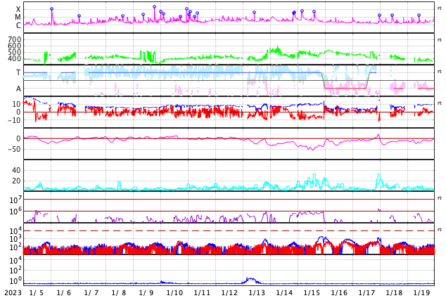 GOES衛星の太陽X線強度。赤・橙 = 0.1〜0.8 nm、青・紫 = 0.05〜0.4 nm (c) データ:NOAA/SWPC、作図:宇宙天気ニュース ![]() | |||||||||||||||||||||||||||||||||||||||||||||||||||||||||||||||||||||||||||||||||||||||||||||||||||||||||||||||||||||||||||||||||||||||||||||||||||||||||||||||||||||||||||||||||||||||||||||||||||||||||||||||||||||||||||||||||||||||||