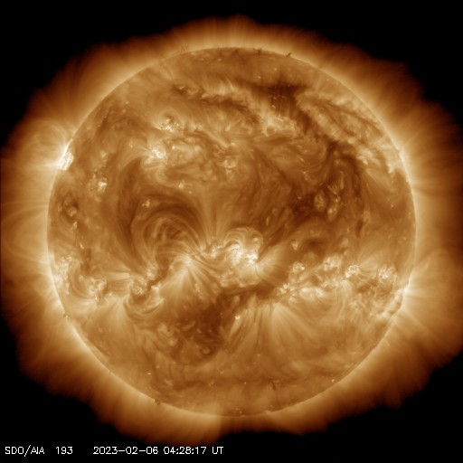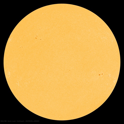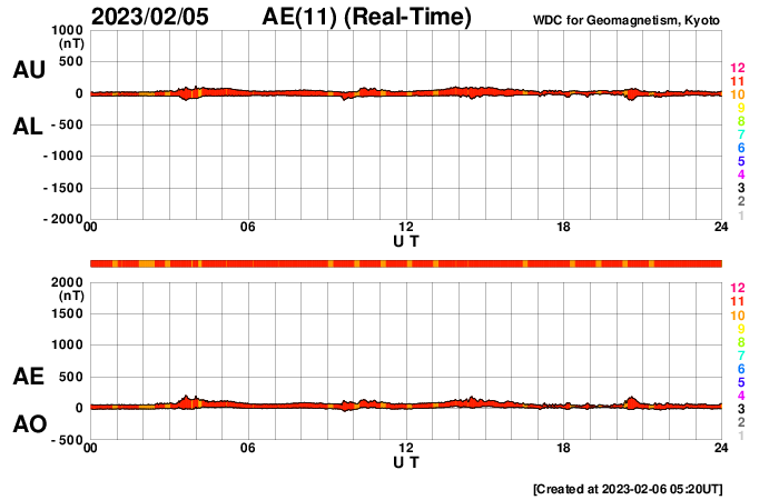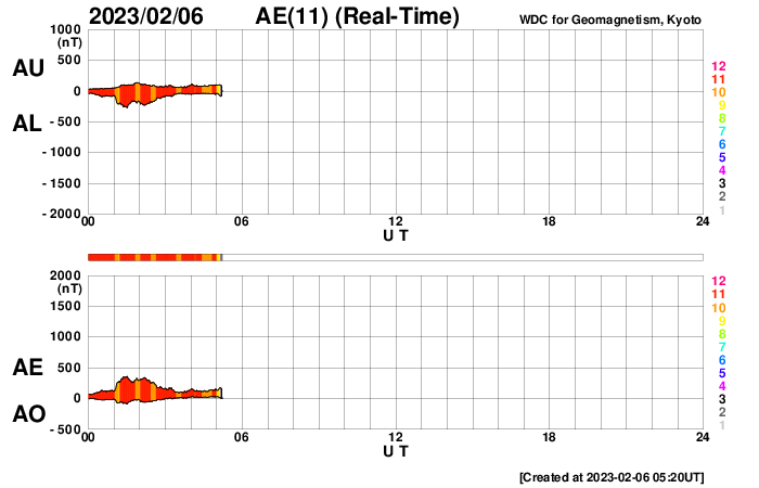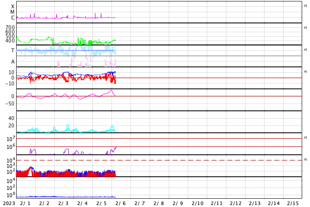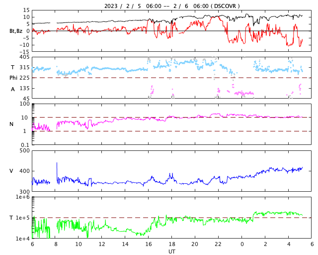 2023/ 2/ 6 14:22 更新 太陽風は平均的な速度で、磁場が強まっています。 担当 篠原 太陽風の速度は、 昨日のニュースの後に350km/秒へ下がりましたが、 今日未明から再びゆっくり上がって、 現在は400km/秒と平均的な速度に戻っています。 太陽風の磁場強度は、5nTと平均的な状態から、 今日に入る頃に10nTに強まり、 以降この状態で推移しています。 南北成分は、グラフの後半で 南向きの変化が目立つようになっています。 AE指数は、グラフの最後で 300nTの小規模の変化が起きている程度ですが、 この後どの様に推移するでしょうか。 27日周期の図を見ると、 前周期の太陽風も、1月10日から磁場強度が10nT近くになり、 速度は400km/秒で推移しています。 今回もこの変化が繰り返されているのでしょうか。 太陽は、昨夜、5日19時半(世界時5日10時半)に 南西(右下)の3211黒点群で C6.4の小規模フレアが発生しましたが、 その後は目立つ規模のフレアは発生していません。 可視光写真では、新しい黒点があちこちに現れています。 この後の変化に注目してください。