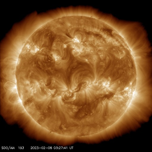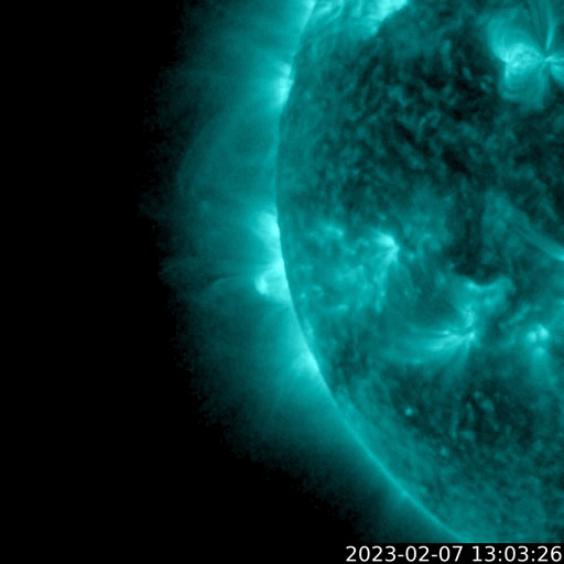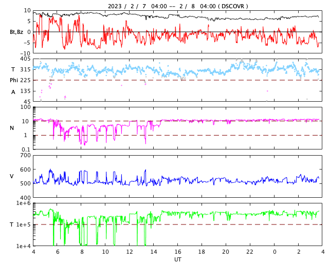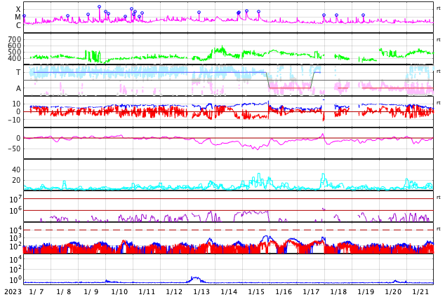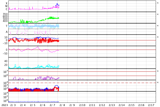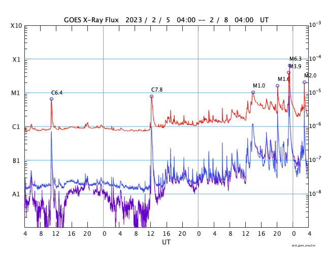2023/ 2/ 8 12:53 更新 M6.3の中規模フレアが発生しました。Mフレアが続いています。 担当 篠原 太陽の中心部北側(上側)の3213黒点群で、 今朝、8日5時(世界時7日20時)にM1.5、 8日8時(世界時7日23時)に、連続するように、M3.8、M6.3と、 中規模フレアが発生しています。 3213群は、昨日のニュースで フレアが目立つようになっていると書きましたが、 更に活動が強まっています。 M6に達するフレアの発生は、1月15日のM6.0以来で、 3週間ぶりです。 また、3213群では、昨夜、7日22時(世界時7日13時)頃に、 C5.5などの小規模フレアが発生しているのですが、 SOHO衛星LASCO C2、C3では、 直後に、太陽から上に向かうCME(コロナ質量放出)が観測されています。 3213群のこのフレアに関係しているのかもしれません。 さらに、太陽の南東の端(左下)でも、 昨夜、7日23時(世界時7日15時)にM1.0の中規模フレアが発生しています。 太陽の少し向こう側で発生した現象の様です。 GOES衛星SUVI 131と304の動画を掲載します。 プロミネンスの噴出がきれいに見えています。 今日の可視光写真では、南東の端に黒点が現れています。 この領域で発生した現象ではないでしょうか。 と、ニュースを書いている間に、 3213群でM2.0の中規模フレアが発生しました。 この後も活動に注目して下さい。 太陽風は、500km/秒と高速の風が続いています。 磁場強度は、9nTから5nTに下がり、 その後7nTと少し強まっています。 磁場の南北成分は、弱い南寄りになっていて、 磁気圏では小中規模の活動が続いています。 AE指数は、300nTから1000nTにかけて変化が発生しています。 ![]() 3213黒点群で発生した、M1.5、M3.8、M6.3の中規模フレア。 (c) SDO衛星AIA131 (NASA)、(動画加工 : 宇宙天気ニュース) ![]() 太陽の上に向かって噴出するCME。 (c) SOHO衛星LASCO C2、C3 (ESA & NASA)、(動画加工 : 宇宙天気ニュース) ![]() 太陽の東端の少し向こう側で発生したM1.0の中規模フレア。 (c) GOES衛星SUVI 131、304 (NOAA)、(動画加工 : 宇宙天気ニュース) ![]() SDO衛星のAIA193カメラによる太陽コロナの様子 (c) SDO (NASA) ![]() SDO衛星による太陽の可視光写真。マウスの矢印を写真に重ねると、黒点番号付きの写真に切り替わります。 (c) SDO (NASA) ![]() GOES衛星の太陽X線強度。赤・橙 = 0.1〜0.8 nm、青・紫 = 0.05〜0.4 nm (c) データ:NOAA/SWPC、作図:宇宙天気ニュース ![]() DSCOVRが観測した太陽風の磁場(黒線は全体の強度、赤線は南北成分) 磁場の向き、プラズマの密度、速度、温度 (c) データ:NOAA/SWPC、作図:宇宙天気ニュース ![]() AE指数(速報値) 下段のAEグラフの値が高くなると、オーロラ活動が活発化しています。 (c) 京都大学WDC ![]() ![]() 27日の太陽周期に合わせた図 太陽が同じ面を地球に向けていた27日前の変化から、今後を予想することができます。 (c) 作図:宇宙天気ニュース