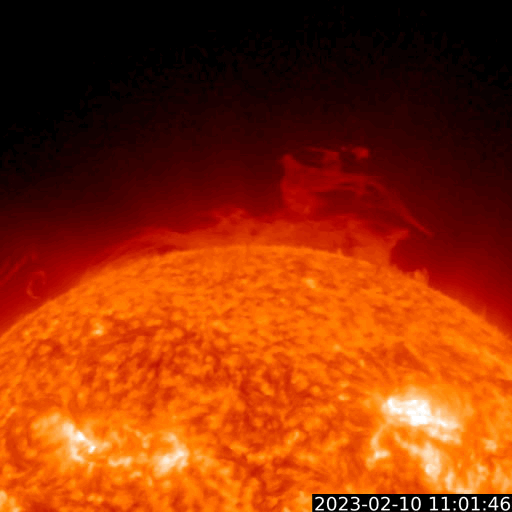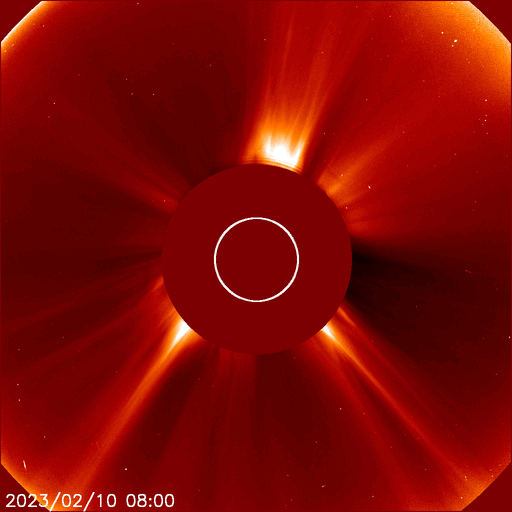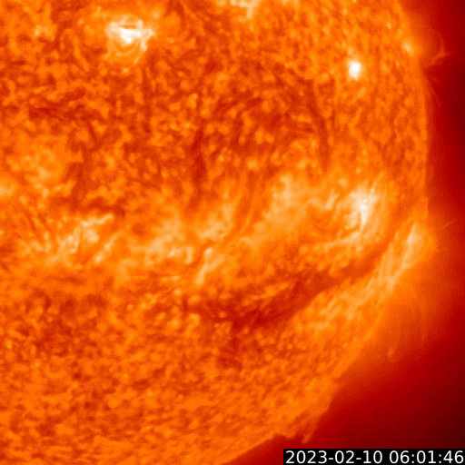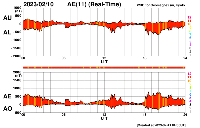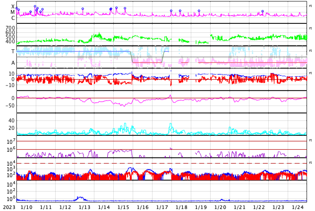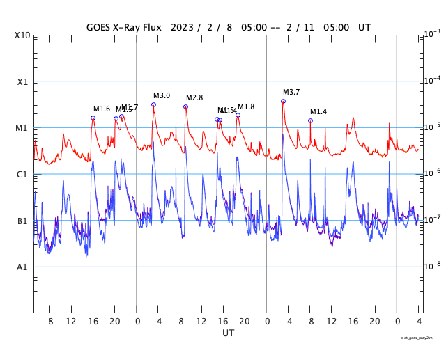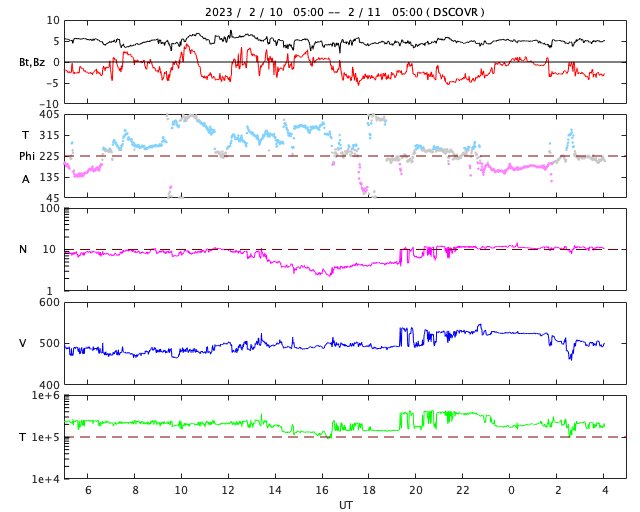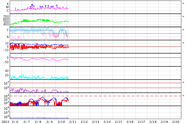 2023/ 2/11 13:17 更新 Mクラスのフレアが続いています。太陽風は高速です。 担当 篠原 SOHO衛星LASCO C2、C3によると、 昨夜から今朝にかけて、 太陽の右下と上に向かって CME(コロナ質量放出)が発生しています。 GOES衛星SUVI 304を参照すると、 1つめのCMEは、太陽の南西側(右下)で 10日16時(世界時10日7時)頃に発生した フィラメント噴出に関係している可能性があります(2枚目の動画)。 この場合、太陽の中心に比較的近い所で発生しているので、 噴出したガスは地球の方向へもやって来る可能性があります。 明後日、13日頃の太陽風に乱れが見られるかもしれません。 2つめのCMEは、太陽の北の端(上側)で 10日23時(世界時10日14時)頃に発生した プロミネンス噴出によるものの様です(3枚目の動画)。 なかなか大きい噴き上がりが見えています。 地球に対して横向きなので、影響はないでしょう。 太陽では、Mクラスの中規模フレアが続いています。 昨日のニュース以降、3213群で、M1.4、M1.1、M1.6、 3220群でM1.2が発生しています。 発生頻度は少し下がっている様に感じますが、 引き続き注目してください。 太陽風は、500km/秒前後の高速の風が続いています。 磁場強度は5nTと平均的な状態です。 7日に始まった高速太陽風は、5日目に入っています。 磁場の南北成分は、南寄りの傾向が続いています。 磁気圏は活動的な状態が続き、 AE指数は500nTを超えるくらいの中規模の変化が 度々発生しています。