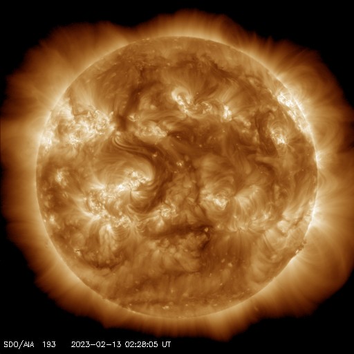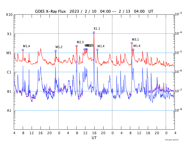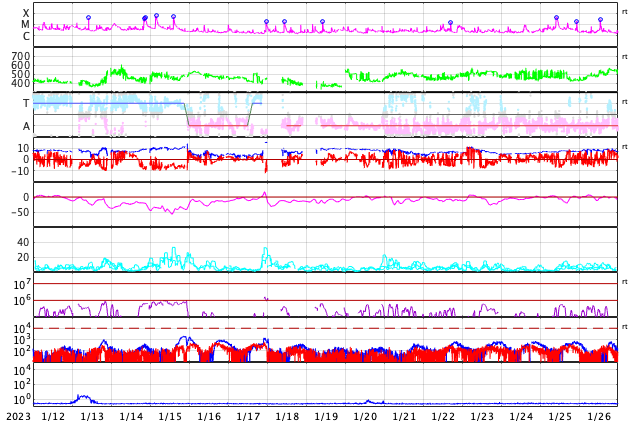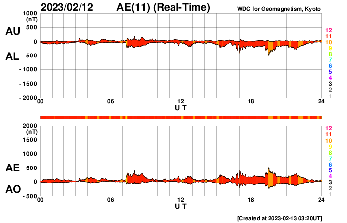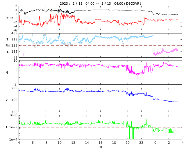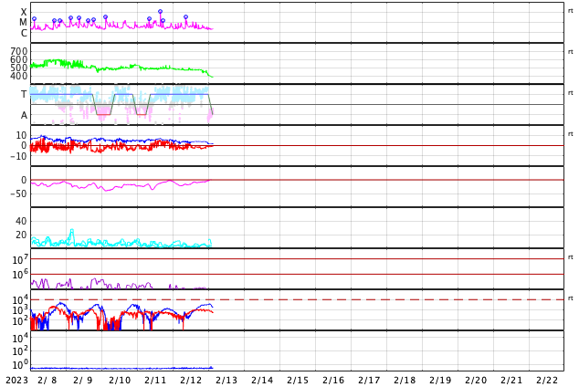 2023/ 2/13 12:39 更新 太陽風は平均的な速度に下がっています。磁気圏は穏やかです。 担当 篠原 Xフレアを起こした3217黒点群は、 昨日のニュース以降も、 M3.1、M1.4、M1.0の中規模フレアを起こしています。 しかし、X線グラフの後半は変化の規模が小さくなっていて、 太陽の活動は落ち着いて来ている様に見えます。 このまま静かになるのか、再び活動が強まるのか、 この後も注目してください。 太陽風は、今朝くらいから速度が一段下がり、 現在は390km/秒と平均的な状態に戻っています。 磁場強度は、4nTから2nTに下がって弱くなっています。 27日周期の図を見ると、 セクターのグラフの傾向が、 前周期と同様にTからAへ切り替わろうとしている様です。 磁場の南北成分は、 弱い南寄りの傾向が続いていましたが、 グラフの最後で南向きの変化は小さくなっています。 このため、AE指数は、 グラフの途中までは小規模の変化が続いていましたが、 最後は変化が見られなくなっています。 この後は、磁気圏は穏やかに推移しそうです。 ![]() SDO衛星のAIA193カメラによる太陽コロナの様子 (c) SDO (NASA) ![]() SDO衛星による太陽の可視光写真。マウスの矢印を写真に重ねると、黒点番号付きの写真に切り替わります。 (c) SDO (NASA) ![]() GOES衛星の太陽X線強度。赤・橙 = 0.1〜0.8 nm、青・紫 = 0.05〜0.4 nm (c) データ:NOAA/SWPC、作図:宇宙天気ニュース ![]() DSCOVRが観測した太陽風の磁場(黒線は全体の強度、赤線は南北成分) 磁場の向き、プラズマの密度、速度、温度 (c) データ:NOAA/SWPC、作図:宇宙天気ニュース ![]() AE指数(速報値) 下段のAEグラフの値が高くなると、オーロラ活動が活発化しています。 (c) 京都大学WDC ![]() ![]() 27日の太陽周期に合わせた図 太陽が同じ面を地球に向けていた27日前の変化から、今後を予想することができます。 (c) 作図:宇宙天気ニュース