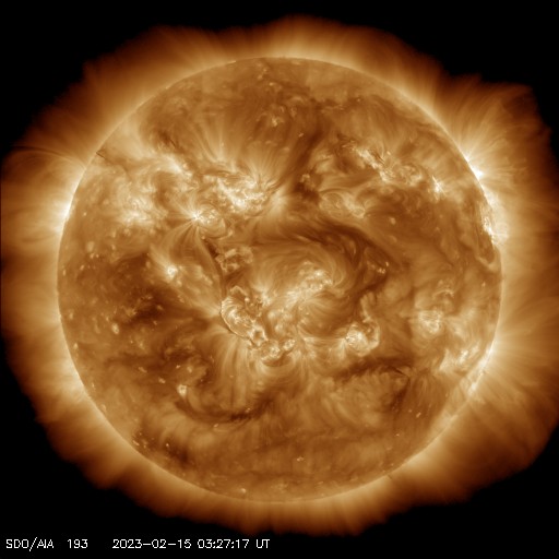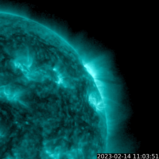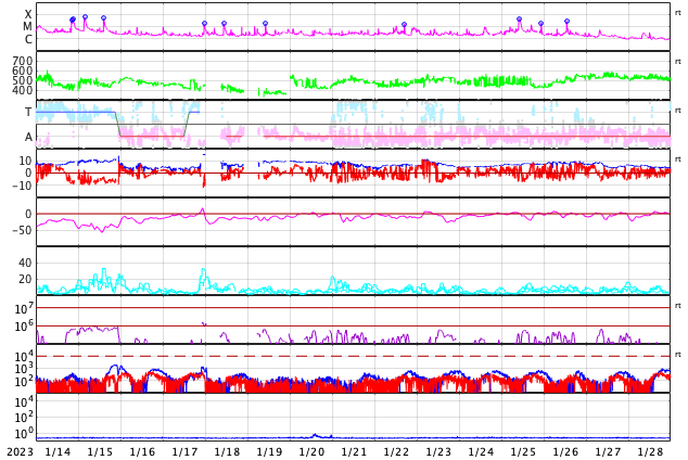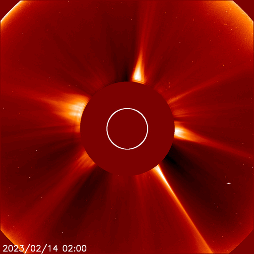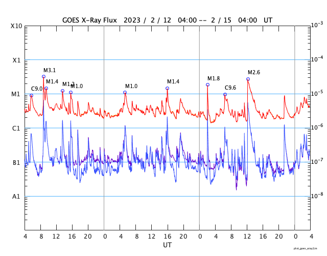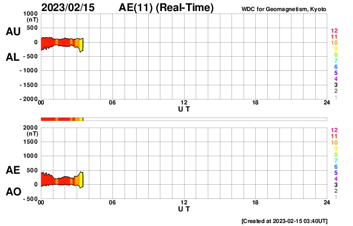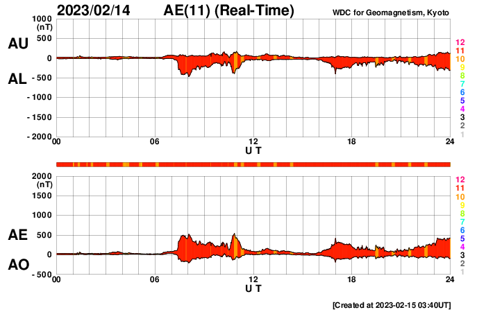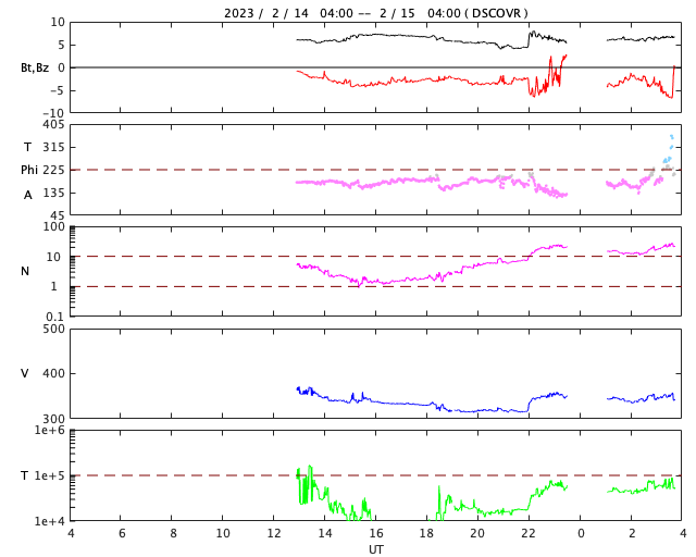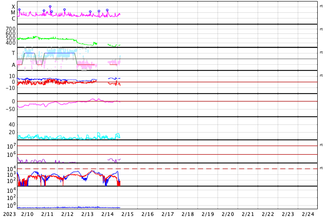 2023/ 2/15 12:59 更新 太陽風は低速ですが、磁気圏は少し活動的です。 担当 篠原 SOHO衛星LASCO C2、C3によると、 昨日の昼、14日13時(世界時14日4時)に、 太陽の左側に向かってCME(コロナ質量放出)が飛び出しています。 動画を掲載します。 STEREO Ahead衛星の画像を参照すると、 太陽の向こう側で発生した現象の様です。 活動的な領域が近付いているのかもしれません。 また、太陽の北西の端(右上)に達した3213黒点群で、 昨夜、14日21時(世界時14日12時)に、 M2.6の中規模フレアが発生しました。 GOES衛星SUVI 131の動画を掲載します。 3213群は、この後も、 C8.9やC8.1の小規模フレアを起こしていますが、 黒点は見えなくなっています。 太陽風は、350km/秒から320km/秒へ下がり、 今朝、350km/秒へ少し上がる変化が発生していますが、 低速の状態が続いています。 磁場強度は、5〜7nTと平均的な状態です。 磁場の南北成分は、弱い南向きになっています。 速度が下がっているので変化は限定的ですが、 AE指数は200〜500nTの小規模の変化が続いています。