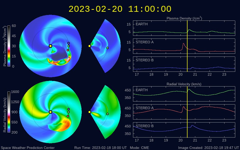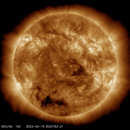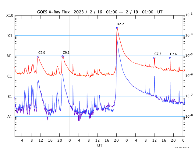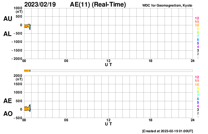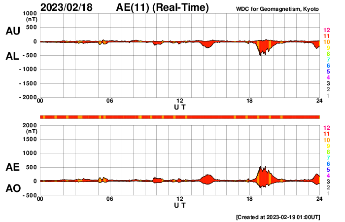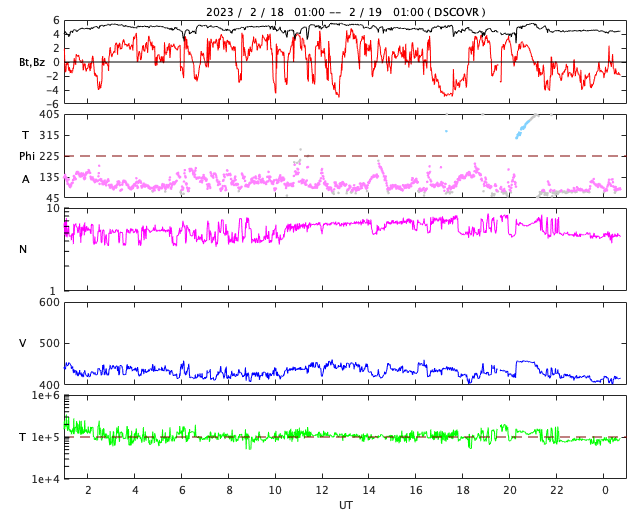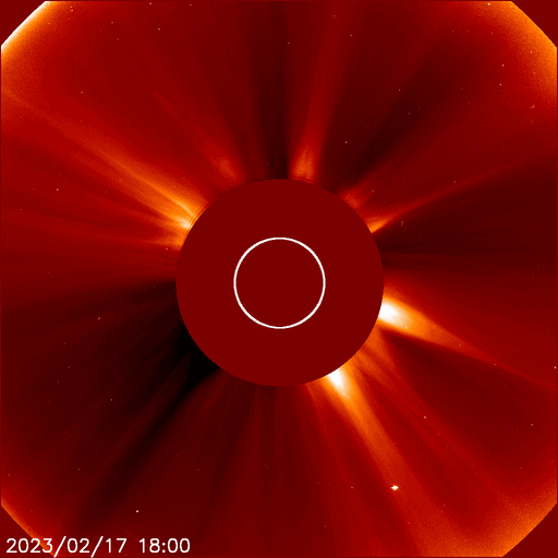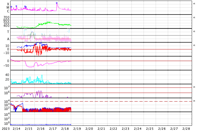 2023/ 2/19 10:00 更新 CMEによる太陽風の乱れは、明日、20日の夜に到来する可能性があります。 担当 篠原 昨日のX2.2の大規模フレアで発生したCME(コロナ質量放出)について、 SOHO衛星LASCO C2、C3の動画を掲載します。 フレアの発生地点が太陽の北東側(左上)だったので、 CMEも左上により濃く噴出しています。 一方、右下を含む太陽全体を囲むようにもガスは広がっていて、 噴出は地球の方向へも向かっていると考えられます。 NOAA/SWPCの太陽風予報によると、 明日の夜、20日20時(世界時20日11時)頃に 太陽風の乱れが地球(図の緑の丸)に到来する可能性があるとのことです。 この予報によると、 CMEの端の方がかろうじて地球にやって来る程度で、 速度の高まりは450km/秒とやや高速になる程度です。 実際にどの様な変化がやって来るでしょうか。 太陽風の乱れがやって来て、磁場が南向きに強まると、 オーロラの活動が激しくなる可能性があります。 良い時間帯であればライブカメラにも注目です。 SOHO衛星の動画では、左下に飛び出すCMEも見えています。 これは太陽の向こう側で発生した現象です。 地球への影響はありません。 Xフレアを起こした3229黒点群は、 その後は目立った活動はありません。 太陽では、北西(右上)の3226黒点群で、 C7.7、C7.6などの小規模フレアが発生しています。 太陽風は、430km/秒前後の平均的な速度で安定しています。 磁場強度も、4〜5nTと平均的な状態です。 磁場の南北成分は、小幅で南北に変化しています。 AE指数は、200〜500nTの小規模の変化が時々発生する程度で、 全体としては磁気圏は穏やかです。 ![]() X2.2の大規模フレアに伴って発生したCMEの様子。 (c) SOHO衛星LASCO C2、C3 (ESA & NASA)、(動画加工 : 宇宙天気ニュース) ![]() CMEによる太陽風の乱れは、20日20時(世界時20日11時)頃に到来する可能性があります。 (c) NOAA/SWPC ![]() SDO衛星のAIA193カメラによる太陽コロナの様子 (c) SDO (NASA) ![]() SDO衛星による太陽の可視光写真。マウスの矢印を写真に重ねると、黒点番号付きの写真に切り替わります。 (c) SDO (NASA) ![]() GOES衛星の太陽X線強度。赤・橙 = 0.1〜0.8 nm、青・紫 = 0.05〜0.4 nm (c) データ:NOAA/SWPC、作図:宇宙天気ニュース ![]() DSCOVRが観測した太陽風の磁場(黒線は全体の強度、赤線は南北成分) 磁場の向き、プラズマの密度、速度、温度 (c) データ:NOAA/SWPC、作図:宇宙天気ニュース ![]() AE指数(速報値) 下段のAEグラフの値が高くなると、オーロラ活動が活発化しています。 (c) 京都大学WDC ![]() ![]() 27日の太陽周期に合わせた図 太陽が同じ面を地球に向けていた27日前の変化から、今後を予想することができます。 (c) 作図:宇宙天気ニュース