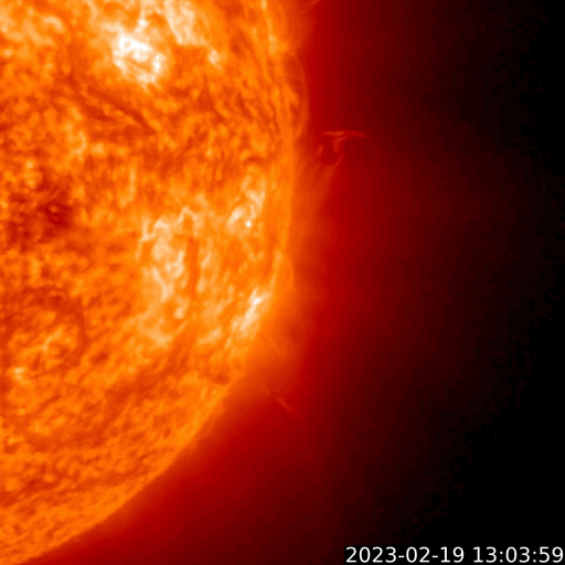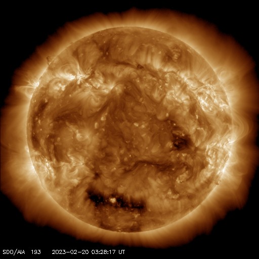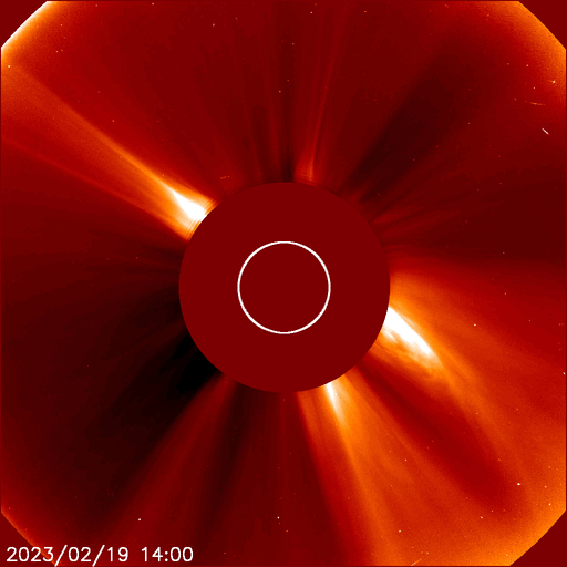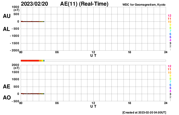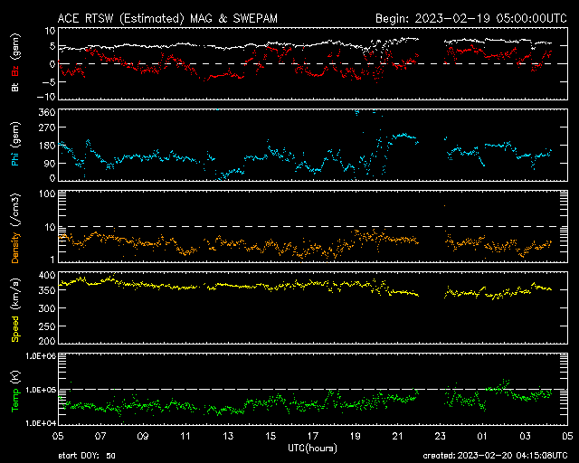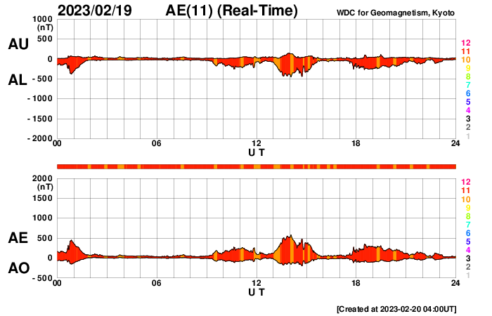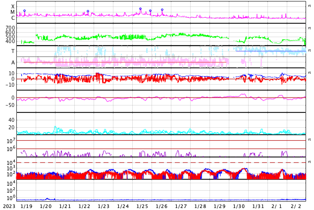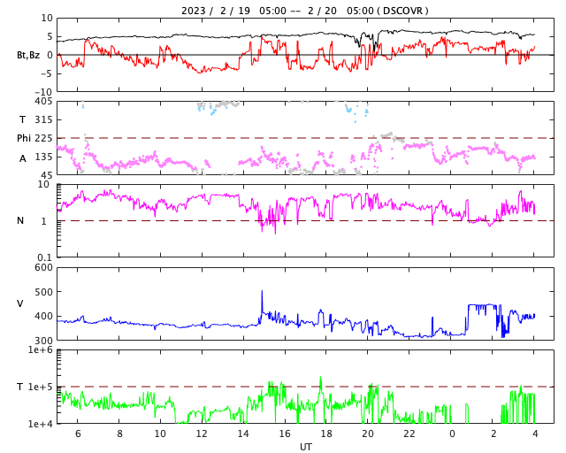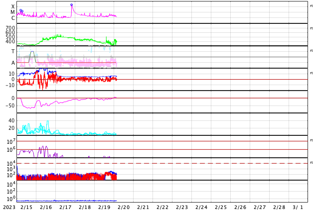 2023/ 2/20 13:11 更新 太陽風は低速の状態です。CMEによる太陽風の乱れが近付いています。 担当 篠原 DSCOVR衛星のデータでは、 太陽風の速度は、 400km/秒から350km/秒へ下がりますが、 途中から上下に変化する様になっています。 これは、観測値が不安定になっている様で、 ACE衛星を参照すると、 現在は、350km/秒前後の低速の状態で推移している様です。 磁場強度は、5〜6nTと平均的な状態です。 南北成分は、南を向いたり、北を向いたり変化していて、 南向きの頃に、 AE指数は300〜500nTの小規模の変化が発生しています。 この後、18日未明に発生したX2.2フレアに伴って発生した CME(コロナ質量放出)による太陽風の乱れが 到来すると考えられます。 明日の午前中にかけて、太陽風の変化に注目してください。 太陽風の磁場が南向きに強まると、 磁気圏の活動はより活発になります。 速度の変化だけでなく、 磁場(特に南向き成分)の変化にも注目してください。 太陽は、北西(右上)の3226黒点群でC6.8、 北東(左上)の3229群でC4.7、 南東(左下)の3230群でC3.7など、 あちこちで小規模フレアが発生しています。 さらに、北東の端でもC5.7などのフレアが発生していて、 新しい領域が近づいている様です。 また、南東(右下)の端で、 昨夜、19日23時(世界時19日14時)頃から プロミネンス噴出が発生しています。 GOES衛星SUVI 304の動画を掲載します。 これにより、太陽の右下に向かってCMEが発生しています。 SOHO衛星LASCO C2、C3の動画を掲載します。 地球に対して横向きの噴出なので、影響はありません。