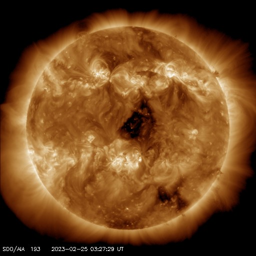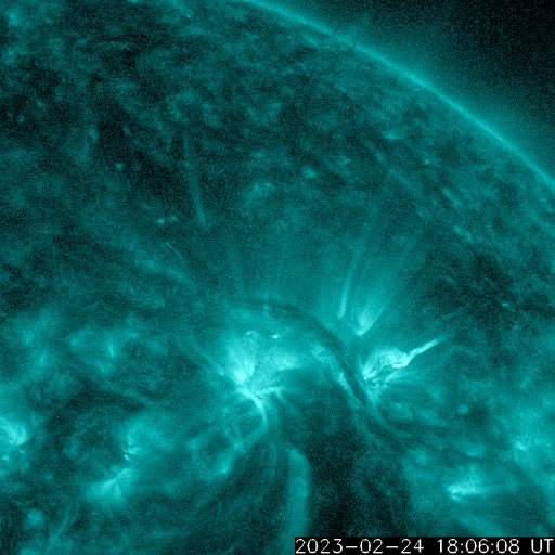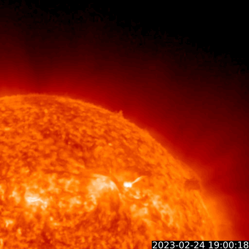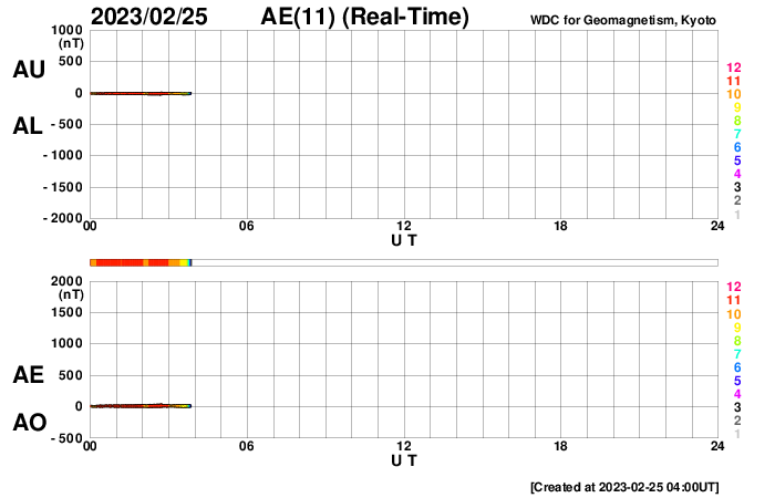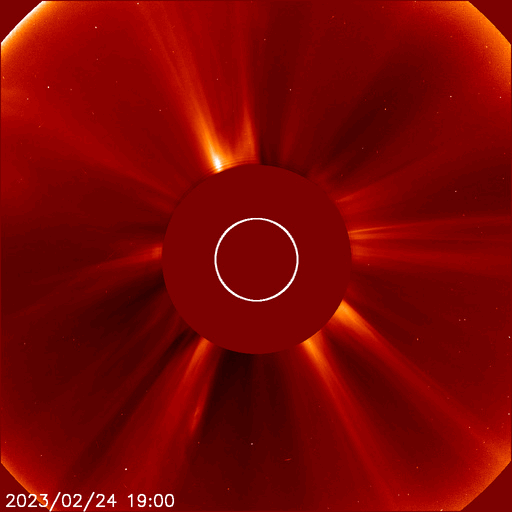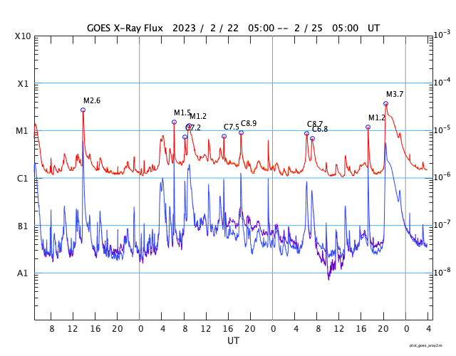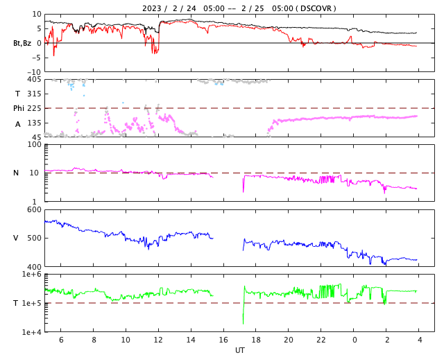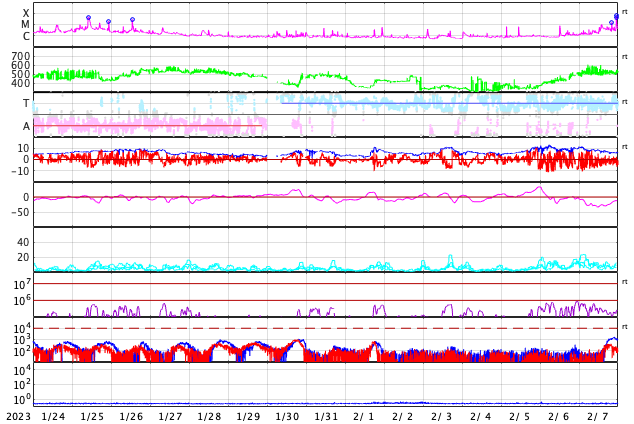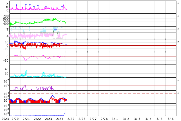 2023/ 2/25 13:07 更新 M3.7の中規模フレアが発生しました。CMEの乱れは地球にも向かっている様です。 担当 篠原 今朝早く、25日5時(世界時24日20時)に、 太陽の北西側(右上)の3229黒点群で M3.7の中規模フレアが発生しました。 SDO衛星AIA131の動画を掲載します。 3229群は、北東の端(左上)に現れたばかりの 世界時17日にX2.2の大規模フレアを起こした領域です(記事)。 その後は、21日にかけて Cクラスの小規模フレアを起こした程度で、 この3日ほどは穏やかだったのですが、 いきなりの大きな変化になりました。 GOES衛星SUVI 304を見ると、 フィラメント噴出も発生していて、 太陽の右上に向かって コロナのガスが大きく飛び出しています。 SOHO衛星LASCO C2、C3では、 太陽の右上を中心に飛び出すCME(コロナ質量放出)が 観測されています。 太陽の左下にも淡くガスが広がっている様に見えるので、 CMEによる太陽風の乱れは 地球の方向へも向かっているのではないでしょうか。 到来は、27日の午後か28日くらいでしょうか。 注目して下さい。 太陽風は、昨日のニュース以降は次第に速度が下がり、 今朝くらいで500km/秒台を割り、 現在は420km/秒と平均的な速度に戻っています。 磁場強度も同様に低下して、現在は3nTとやや弱い状態です。 磁場の南北成分は、 グラフの中盤まで北寄りに強まった状態が続き、 その後は0nT付近です。 磁気圏は穏やかで、AE指数はほとんど変化がありません。 27日周期の図を見ると、 速度の高まりは2日程度で終わっています。 SDO衛星AIA193では、 中心のコロナホールが西側に進んでいます。 明後日くらいからこの領域の影響が始まりそうですが、 今日のCMEによる乱れと重なりそうです。 どの様な変化になるでしょうか。