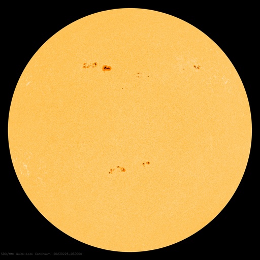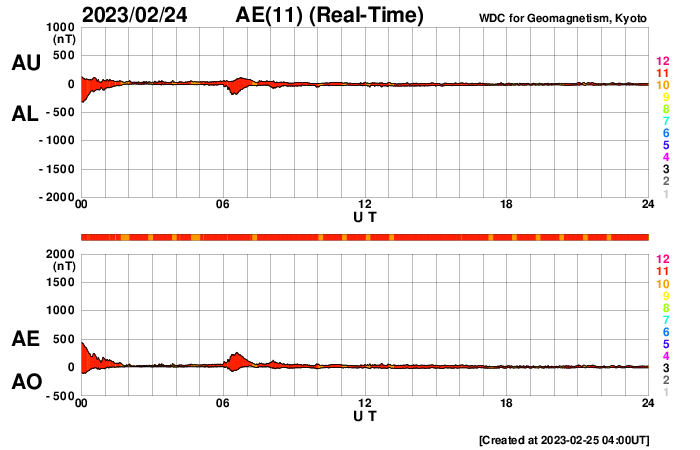 (c) SDO衛星AIA131 (NASA)、(動画加工 : 宇宙天気ニュース) ![]() フィラメント噴出の様子。 (c) GOES衛星SUVI 304 (NOAA)、(動画加工 : 宇宙天気ニュース) ![]() 太陽の右上を中心に飛び出すCME。 (c) SOHO衛星LASCO C2、C3 (ESA & NASA)、(動画加工 : 宇宙天気ニュース) ![]() SDO衛星のAIA193カメラによる太陽コロナの様子 (c) SDO (NASA) ![]() SDO衛星による太陽の可視光写真。マウスの矢印を写真に重ねると、黒点番号付きの写真に切り替わります。 (c) SDO (NASA) ![]() GOES衛星の太陽X線強度。赤・橙 = 0.1〜0.8 nm、青・紫 = 0.05〜0.4 nm (c) データ:NOAA/SWPC、作図:宇宙天気ニュース ![]() DSCOVRが観測した太陽風の磁場(黒線は全体の強度、赤線は南北成分) 磁場の向き、プラズマの密度、速度、温度 (c) データ:NOAA/SWPC、作図:宇宙天気ニュース ![]() AE指数(速報値) 下段のAEグラフの値が高くなると、オーロラ活動が活発化しています。 (c) 京都大学WDC ![]() ![]() 27日の太陽周期に合わせた図 太陽が同じ面を地球に向けていた27日前の変化から、今後を予想することができます。 (c) 作図:宇宙天気ニュース