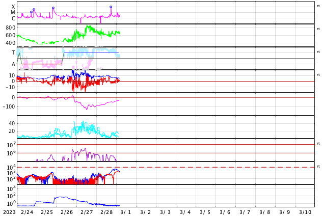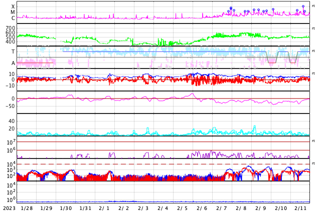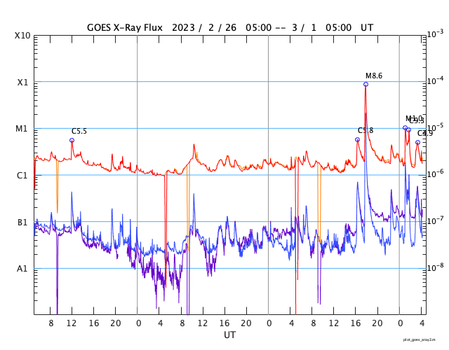 GOES衛星の太陽X線強度。赤・橙 = 0.1〜0.8 nm、青・紫 = 0.05〜0.4 nm (c) データ:NOAA/SWPC、作図:宇宙天気ニュース ![]() | ||||||||||||||||||||||||||||||||||||||||||||||||||||||||||||||||||||||||||||||||||||||||||||||||||||||||||||||||||||||||||||||||||||||||||||||||||||||||||||||||||||||||||||||||||||||||||||||||||||||||||||||||||||||||||||||||||||||||||||||||||||||||||||||||