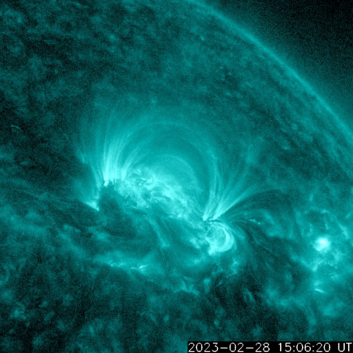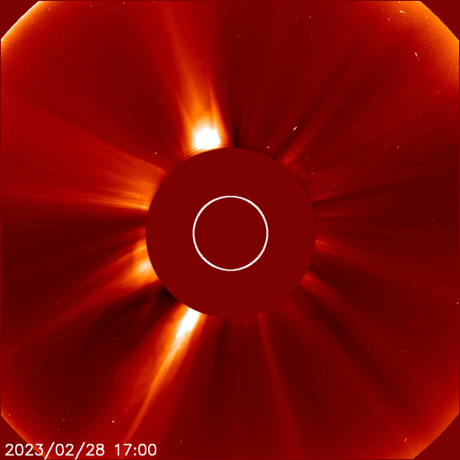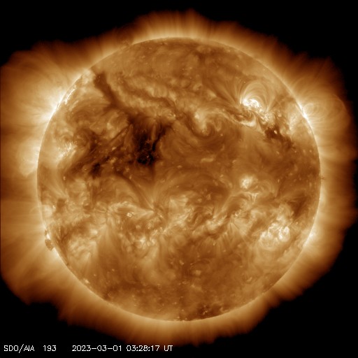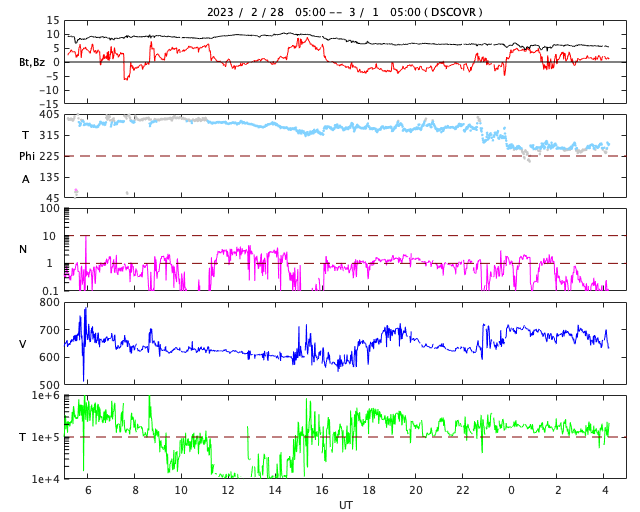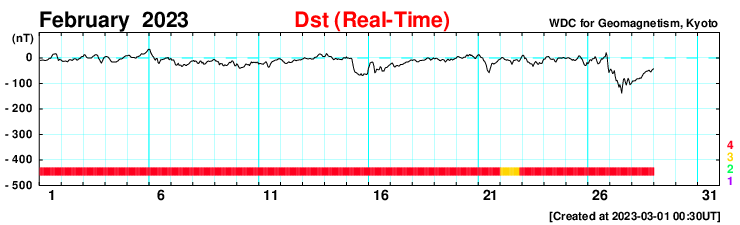 2023/ 3/ 1 13:21 更新 600km/秒台の高速太陽風が続いています。磁気圏は静かになっています。 担当 篠原 昨日のニュース以降、 太陽風の速度は深夜にかけて600km/秒に下がりましたが、 そこから再び上昇が始まって、 現在は670km/秒とより高速の状態に戻っています。 太陽風の磁場強度は、 9nTからゆっくりと低下して、 現在は6nTと平均的な値に戻っています。 磁場の南北成分は、北寄りになったり、南寄りになったり、 時間とともに変化しています。 このため、AE指数は、 活動が強まる時間帯と静かな時間帯に 比較的はっきりと分かれています。 活動が強まると、700nTの中規模の変化から 最大では1300nTに達する大きい変化まで発生しています。 太陽風のグラフの最後では、磁場は北寄りになっています。 このため、AE指数も最後は変化が見られなくなっています。 太陽風の強まった状態は続いているので、 磁場の南北成分の変化に注目してください。 磁気圏活動の強まりが一段落ついて、 Dst指数はゆっくりと静穏レベルである0nT付近に近付いています。 磁気嵐は終わりに向かっています。 SDO衛星AIA193の太陽コロナ写真では、 中心部の北東寄り(左上)にコロナホールが見えています。 4日後くらいからこの領域の影響が始まりそうです。 太陽は、北西(右上)の3234黒点群の活動が強まって、 今日未明、1日2時半(世界時2月28日17時半)にM8.6、 今朝、1日10時半(世界時1日1時半)にM1.0と中規模フレアが2回と、 その他にもC5.8、C4.3などの小規模フレアが発生しています。 SDO衛星AIA131の動画を掲載します。 SOHO衛星LASCO C2、C3を見ると、 淡いCME(コロナ質量放出)が右上に向かって飛び出している程度です。 地球への影響はなさそうです また、南東(左下)に現れた新しい黒点で、 C9.3と大きめの小規模フレアが発生しています。 この後、黒点やフレアの規模はどうなるでしょうか。 ![]() Dst指数(速報値)は、ゆっくりと0nTに近付いています。 (c) 京都大学WDC ![]() 3234黒点群で発生したM8.6、M1.0などのフレア。 (c) SDO衛星AIA131 (NASA)、(動画加工 : 宇宙天気ニュース) ![]() 淡いCMEが右上に向かって発生しています。 (c) SOHO衛星LASCO C2、C3 (ESA & NASA)、(動画加工 : 宇宙天気ニュース) ![]() SDO衛星のAIA193カメラによる太陽コロナの様子 (c) SDO (NASA) ![]() SDO衛星による太陽の可視光写真。マウスの矢印を写真に重ねると、黒点番号付きの写真に切り替わります。 (c) SDO (NASA) ![]() DSCOVRが観測した太陽風の磁場(黒線は全体の強度、赤線は南北成分) 磁場の向き、プラズマの密度、速度、温度 (c) データ:NOAA/SWPC、作図:宇宙天気ニュース ![]() AE指数(速報値) 下段のAEグラフの値が高くなると、オーロラ活動が活発化しています。 (c) 京都大学WDC ![]() ![]() 27日の太陽周期に合わせた図 太陽が同じ面を地球に向けていた27日前の変化から、今後を予想することができます。 (c) 作図:宇宙天気ニュース