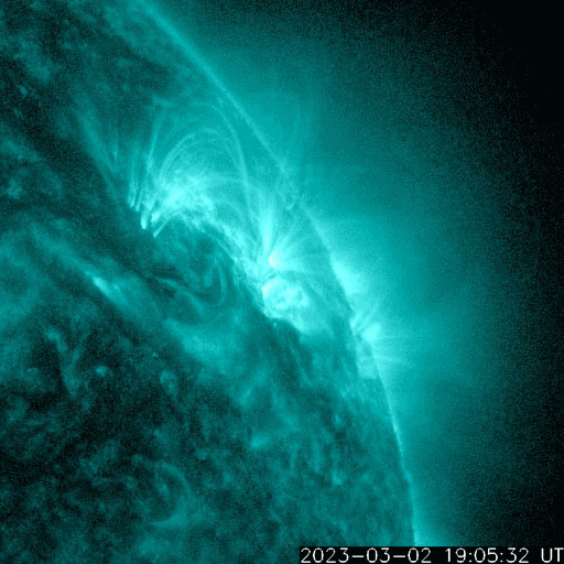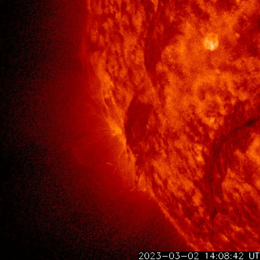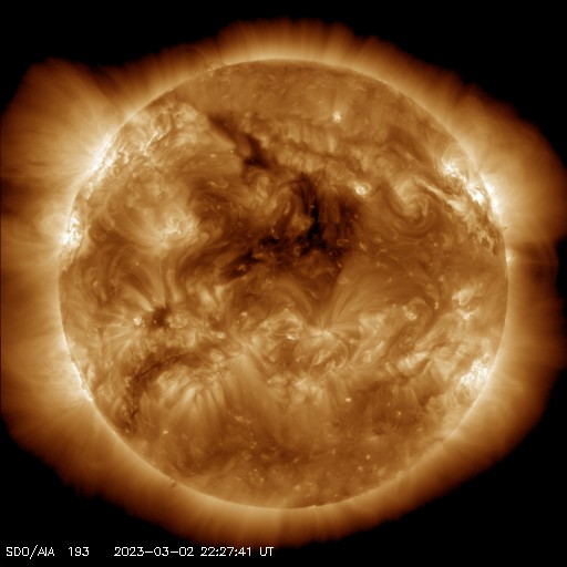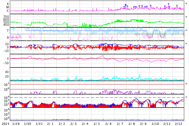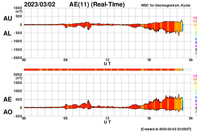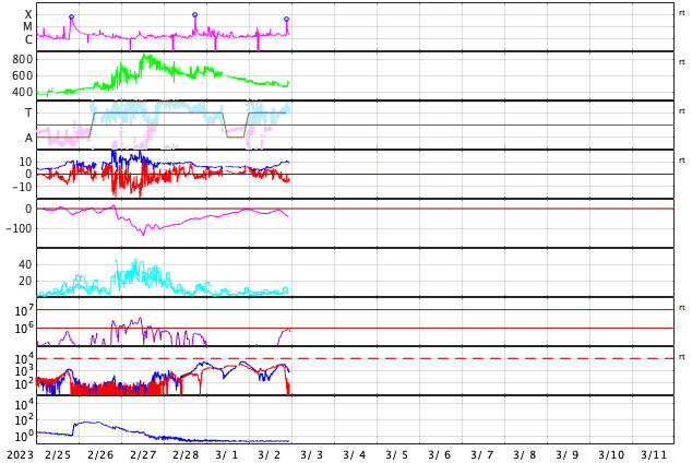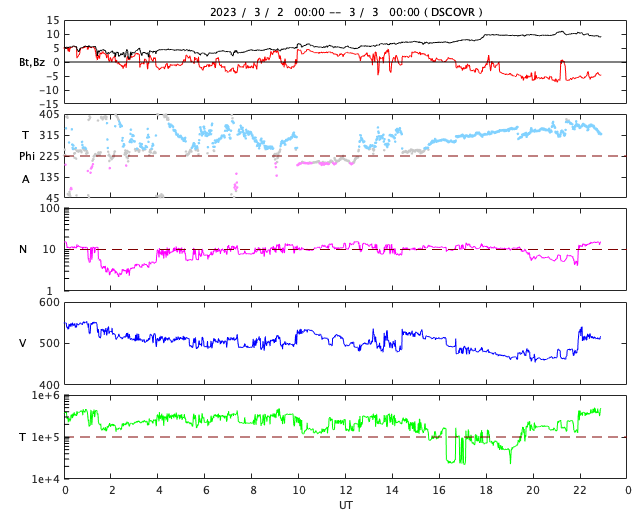 2023/ 3/ 3 08:06 更新 太陽風は高速の状態が続いています。M3.8の中規模フレアが発生しました。 担当 篠原 太陽風は、450〜550km/秒の間を上下しながら推移していて、 全体としてはまだ高速の状態が続いています。 5nTと平均的な状態だった磁場強度は、 今日に入った頃からゆっくりと強まり、 現在は10nTに達しています。 磁場の強まりが流れてきた様です。 南北成分もゆっくりと南向きに強まって、 -5nT程度の変化がしばらく続いています。 このため、磁気圏の活動もやや強まって、 AE指数は700nTの中規模の変化が発生しています。 太陽風磁場の強まりはピークに達している様に見えます。 この後は下がっていきそうです。 SDO衛星AIA193では、 中心部の北側にコロナホールが広がっています。 明後日くらいからこの領域の影響で 太陽風の速度が高まりそうです。 太陽は、今朝、3日6時(世界時2日21時)に、 北西(右上)の3234黒点群でM3.8の中規模フレアが発生しました。 また、深夜、3日1時(世界時2日16時)頃に、 南東の端近く(左下)でフィラメント噴出が発生しています。 地球に対しては横向きですが、 CME(コロナ質量放出)が発生している様です。 今日から、4年ぶりに現地で開催される 種子島ロケットコンテストに参加します。 今、鹿児島港から種子島に向かっているところです。 7日にかけて記事の更新時刻が不安定になります。