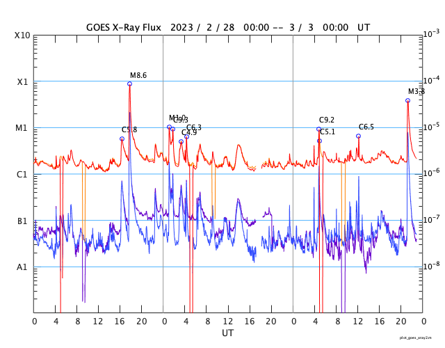 GOES衛星の太陽X線強度。赤・橙 = 0.1〜0.8 nm、青・紫 = 0.05〜0.4 nm (c) データ:NOAA/SWPC、作図:宇宙天気ニュース ![]() | ||||||||||||||||||||||||||||||||||||||||||||||||||||||||||||||||||||||||||||||||||||||||||||||||||||||||||||||||||||||||||||||||||||||||||||||||||||||||||||||||||||||||||||||||||||||||||||||||||||||||||||||||||||||||||||||||||||||||||||||||||||||||||||||||||||||||||||||||||||||||||||||