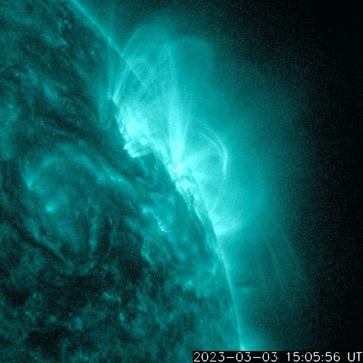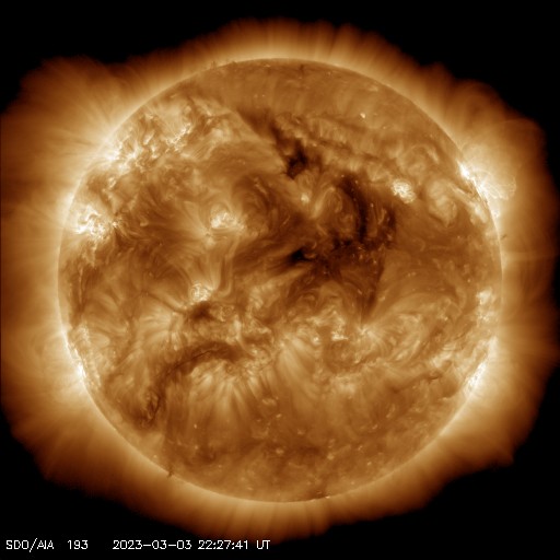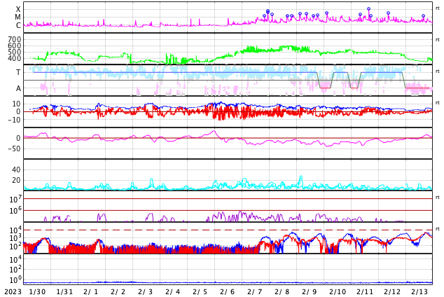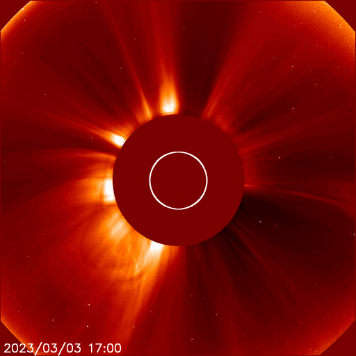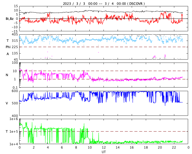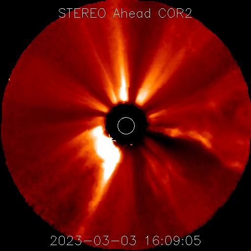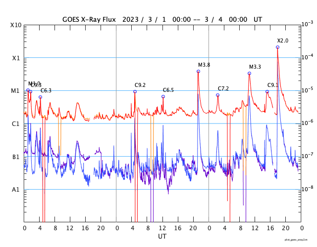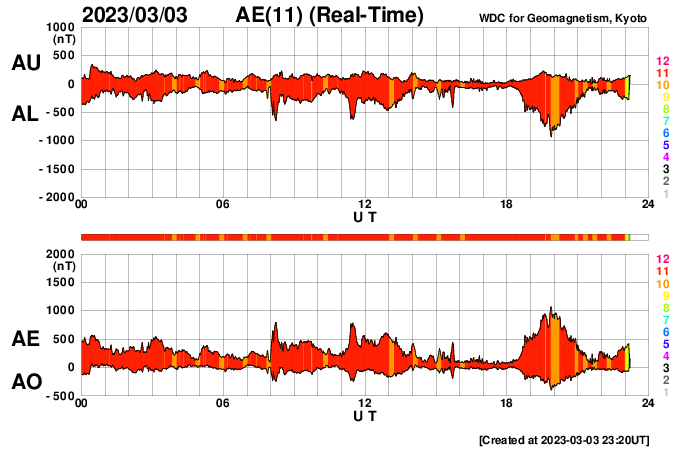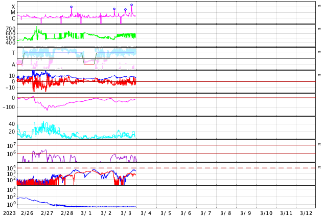 2023/ 3/ 4 08:24 更新 X2.0の大規模フレアが発生しました。横方向にCMEが発生しています。 担当 篠原 今日未明、4日2時半(世界時3日17時半)に、 太陽の北西の端(右上)の3234黒点群で X2.0の大規模フレアが発生しました。 Xフレアの発生は、 世界時2月17日のX2.2以来、2週間ぶりです。 SDO衛星AIA131の動画を掲載します。 このフレアに伴って、 CME(コロナ質量放出)が発生しています。 SOHO衛星の画像は抜けている時間が多く、 LASCO C2の一部の画像を使った 噴出直後までの動画を掲載します。 また、STEREO Ahead衛星COR2の動画も掲載します。 この様子では、CMEは右の横方向に飛び出していて、 地球への影響はなさそうです。 3234群はもうすぐ西の端に沈んで行きます。 この領域の活動が見えるのは、もうしばらくの間です。 太陽風は、グラフでは速度が高まって600km/秒近くに達していますが、 全体の様子から、値が正しいのか不明です。 グラフの後半の様子を見ると、 全体として500km/秒付近で推移していたのではないかと感じます。 磁場強度は7〜9nTと少し強い状態です。 南北成分は、南北に変化していて、 AE指数は700nTや1000nTの中規模の変化が度々発生しています。 SDO衛星AIA193では、コロナホールが西に進んでいます。 現在の太陽風速度の高まりは、 この領域の影響なのでしょうか。 種子島ロケットコンテストは、 天候の関係で競技は明日の実施になりました。 今日はワークショップです。 また、H3の打ち上げが種子島滞在中の6日になったので、 現地で見られると喜んでいます。