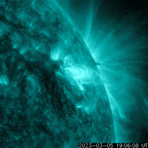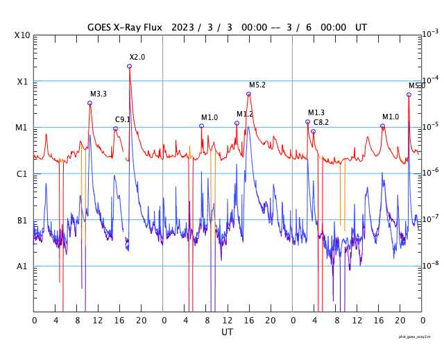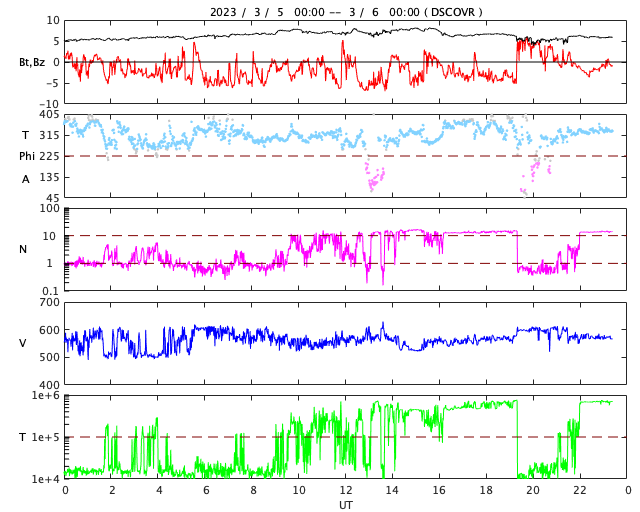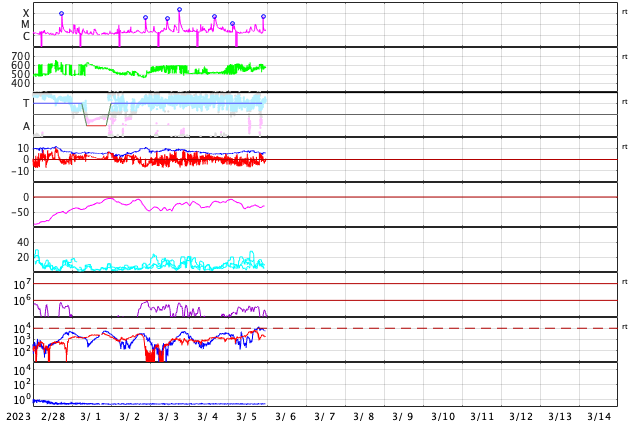 2023/ 3/ 6 08:38 更新 M5.0の中規模フレアが発生しました。太陽風は高速の状態です。 担当 篠原 今朝、6日6時半(世界時5日21時半)に、 太陽の北西(右上)の3243黒点群で、 M5.0の中規模フレアが発生しました。 3243群は、一昨日、4日の夕方にM1.0の中規模フレアを起こし、 その後、C4.2、C8.2、C6.2などの 小規模フレアを起こしていました。 西の端に近付いていますが、 この後も活動が見られるでしょうか。 太陽では、この他にも、 中心部西側(右側)の3238群でM1.0、 中心部東側(左側)の3242群でM1.0の 中規模フレアが発生しています。 太陽風は、速度の値が不安定になっている様ですが、 570km/秒前後の高速の状態で推移している様です。 磁場強度は、6nTと平均的な状態です。 磁場の南北成分は、南寄りで推移しています。 磁気圏の活動も活発になっていて、 AE指数は、1000〜1500nTの大きい変化も発生しています。 27日周期の図を見ると、 前周期の太陽風は、2月7日から速度が高まっています。 今日以降も同様に速度の高まりが続くでしょうか。 ![]() 北西の3243黒点群で、M5.0の中規模フレアが発生しました。 (c) SDO衛星AIA131 (NASA)、(動画加工 : 宇宙天気ニュース) ![]() SDO衛星のAIA193カメラによる太陽コロナの様子 (c) SDO (NASA) ![]() SDO衛星による太陽の可視光写真。マウスの矢印を写真に重ねると、黒点番号付きの写真に切り替わります。 (c) SDO (NASA) ![]() GOES衛星の太陽X線強度。赤・橙 = 0.1〜0.8 nm、青・紫 = 0.05〜0.4 nm (c) データ:NOAA/SWPC、作図:宇宙天気ニュース ![]() DSCOVRが観測した太陽風の磁場(黒線は全体の強度、赤線は南北成分) 磁場の向き、プラズマの密度、速度、温度 (c) データ:NOAA/SWPC、作図:宇宙天気ニュース ![]() AE指数(速報値) 下段のAEグラフの値が高くなると、オーロラ活動が活発化しています。 (c) 京都大学WDC ![]() 27日の太陽周期に合わせた図 太陽が同じ面を地球に向けていた27日前の変化から、今後を予想することができます。 (c) 作図:宇宙天気ニュース