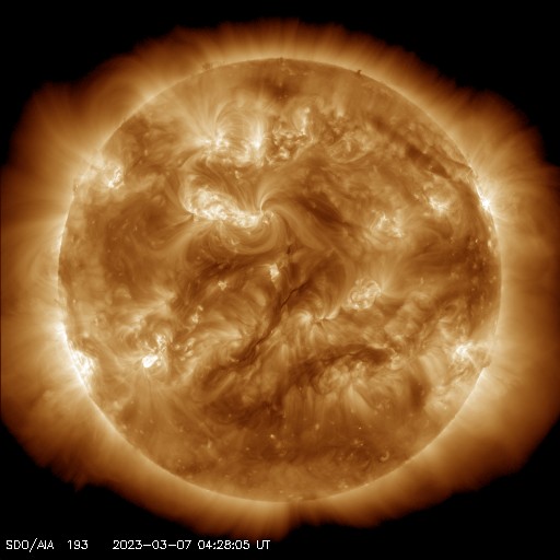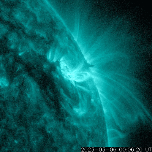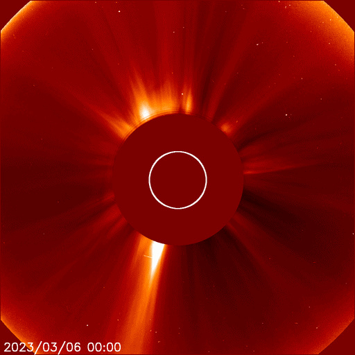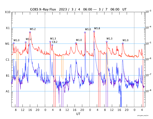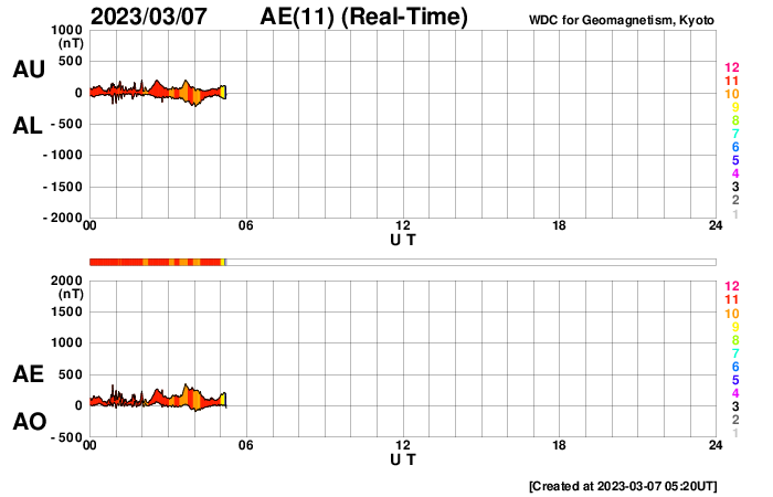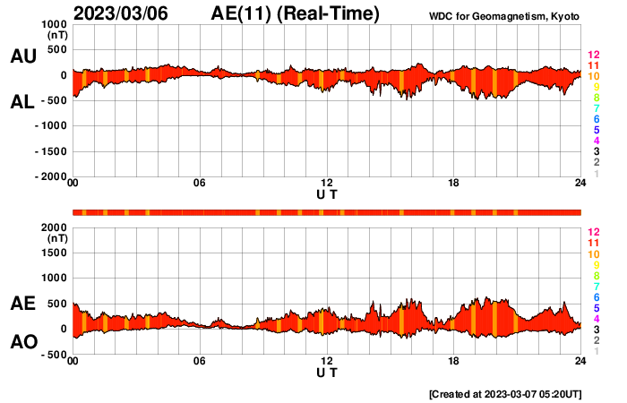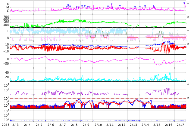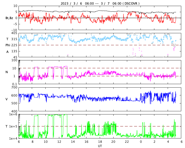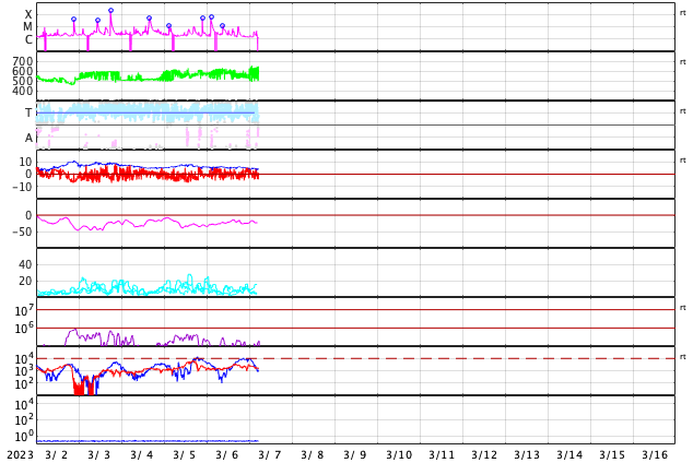 2023/ 3/ 7 14:30 更新 M5.8の中規模フレアが発生しました。高速の太陽風が続いています。 担当 篠原 昨日の昼、6日11時(世界時6日2時)に、 太陽の北西(右上)の3243黒点群で、 M5.8の中規模フレアが発生しました。 SDO衛星AIA131による動画を掲載します。 3243群は西の端に近付いていて、 この後、見えなくなりそうです。 SOHO衛星LASCO C2、C3では、 太陽の右に向かって飛び出す CME(コロナ質量放出)が観測されています。 横向きなので、地球への影響はないでしょう。 太陽風は、速度のデータが不安定ですが、 500km/秒台の高速の状態が続いている様です。 磁場強度は、5nTと平均的な状態です。 磁場の南北成分は、南北に変化が続いています。 このため、磁気圏はある程度活動的な状態で、 AE指数は300〜500nTの中規模の変化が続いています。 これから鹿児島へ戻ります。 午前中にはH3ロケットの打ち上げを見ることができました。 来年の大会で、また種子島に戻って来たいです。 明日から学内のLANが停止する予定です。 引き続き記事の更新が不安定になります。