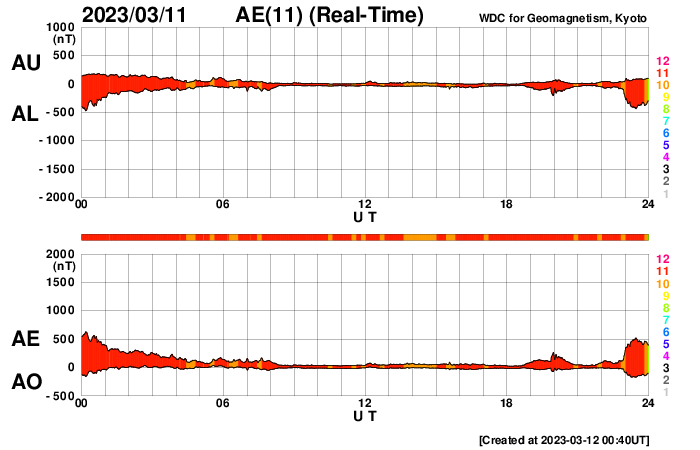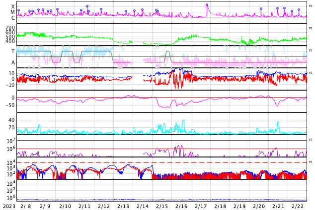 (c) GOES衛星SUVI 304 (NOAA)、(動画加工 : 宇宙天気ニュース) ![]() CMEが太陽の右下に飛び出しています。 (c) SOHO衛星LASCO C2、C3 (ESA & NASA)、(動画加工 : 宇宙天気ニュース) ![]() SDO衛星のAIA193カメラによる太陽コロナの様子 (c) SDO (NASA) ![]() SDO衛星による太陽の可視光写真。マウスの矢印を写真に重ねると、黒点番号付きの写真に切り替わります。 (c) SDO (NASA) ![]() GOES衛星の太陽X線強度。赤・橙 = 0.1〜0.8 nm、青・紫 = 0.05〜0.4 nm (c) データ:NOAA/SWPC、作図:宇宙天気ニュース ![]() DSCOVRが観測した太陽風の磁場(黒線は全体の強度、赤線は南北成分) 磁場の向き、プラズマの密度、速度、温度 (c) データ:NOAA/SWPC、作図:宇宙天気ニュース ![]() ACEが観測した太陽風の磁場(1番上の枠、白線は全体の強度、赤線は南北成分) および、太陽風の密度(3番目の橙線)、速度(4番目の黄線) (c) NOAA/SWPC ![]() AE指数(速報値) 下段のAEグラフの値が高くなると、オーロラ活動が活発化しています。 (c) 京都大学WDC ![]() ![]() 27日の太陽周期に合わせた図 太陽が同じ面を地球に向けていた27日前の変化から、今後を予想することができます。 (c) 作図:宇宙天気ニュース