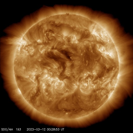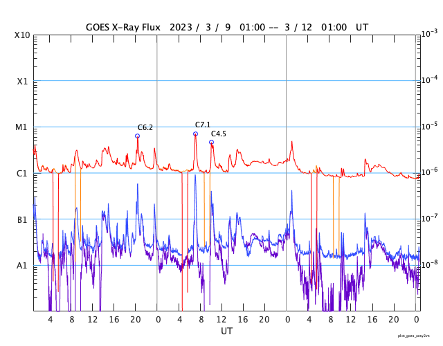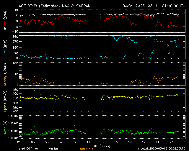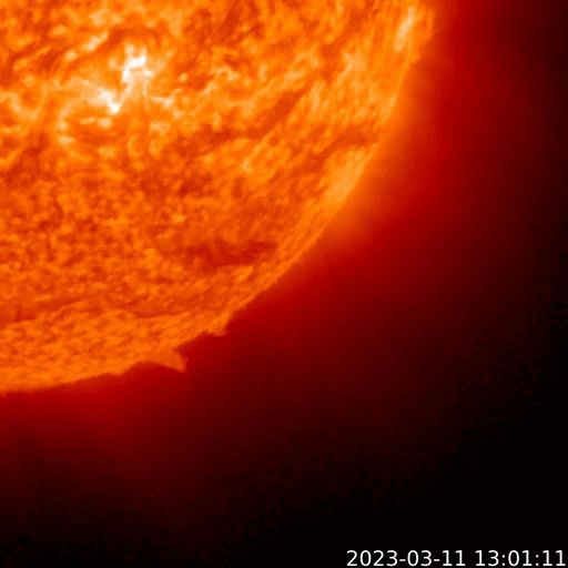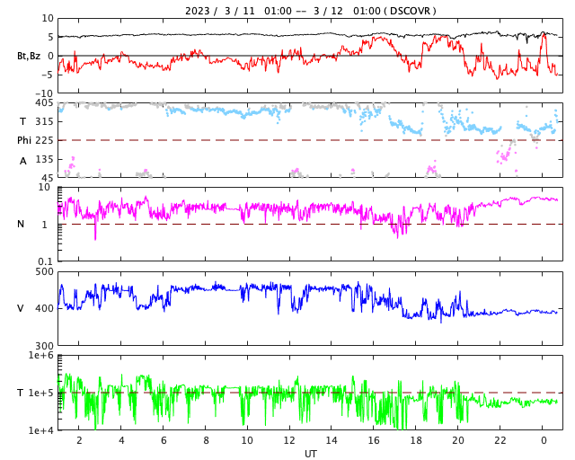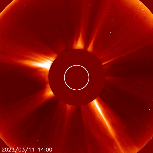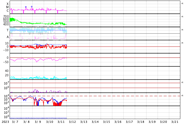 2023/ 3/12 10:00 更新 太陽の南西でフィラメント噴出が発生しました。太陽風は低速になっている様です。 担当 篠原 昨夜、11日23時(世界時11日14時)頃、 太陽の南西の端近く(右下)で、 フィラメント噴出が発生しました。 GOES衛星SUVI 304の動画を掲載します。 これにより、太陽の右下に向かって CME(コロナ質量放出)が発生しています。 SOHO衛星LASCO C2、C3では、 コロナのガスが丸く広がっていく様子が良く見えています。 地球に対しては横向きの噴出なので、 影響はないでしょう。 太陽では、南西の3245黒点群で、 C4.9やC1台の小規模フレアが発生した程度です。 X線グラフは変化が見られなくなっています。 太陽風は、DSCOVR衛星の速度のグラフが 不安定になっている様です。 ACE衛星のデータを参照すると、 350km/秒の低速の状態から、 グラフの最後は380km/秒に少し上がっています。 全体として穏やかな状態が続いている様です。 磁場の南北成分は、 グラフの後半から南北に変化が見られる様になっています。 AE指数も最後に500nTの変化が発生しています。 この後、磁場の南北成分はどの様に変化するでしょうか。