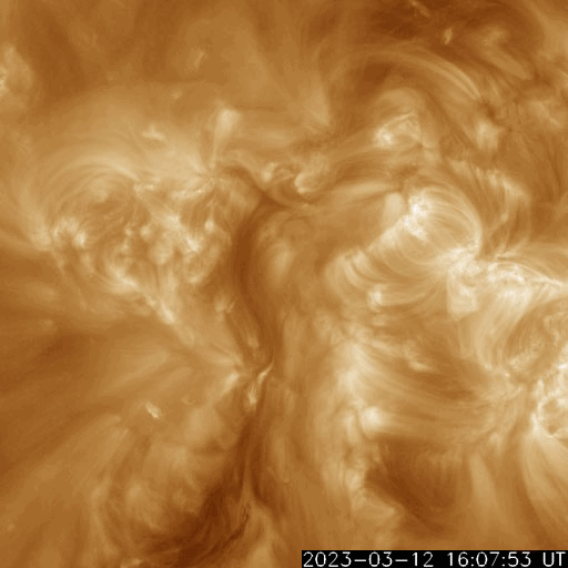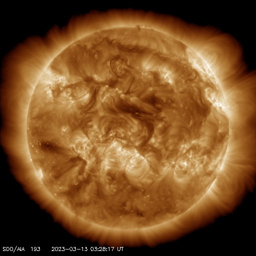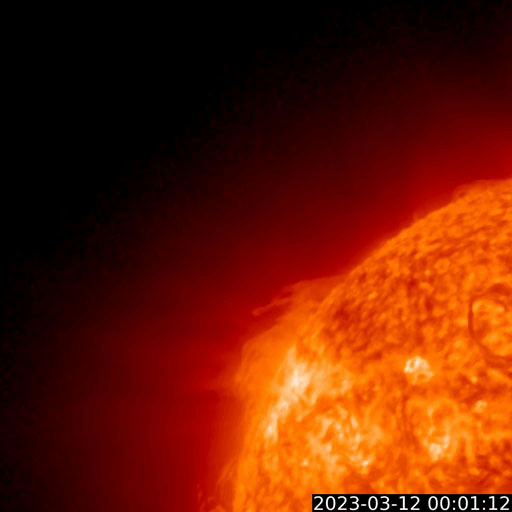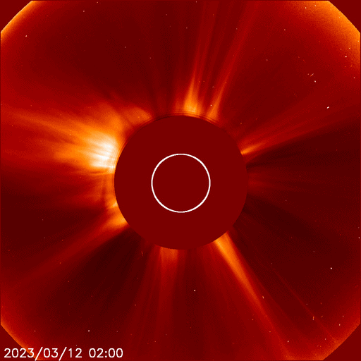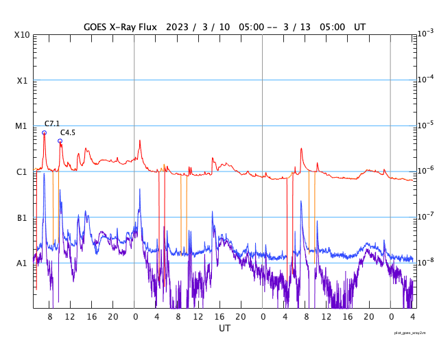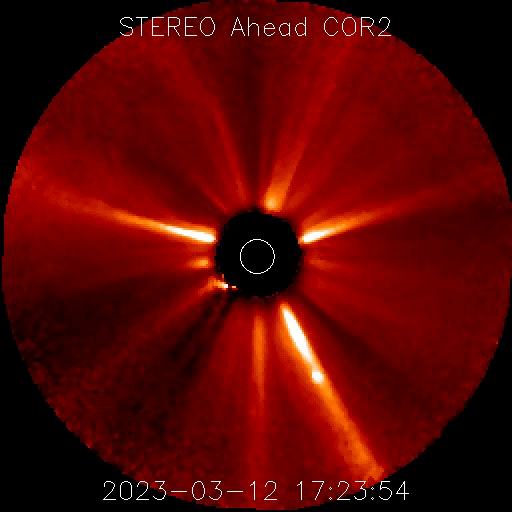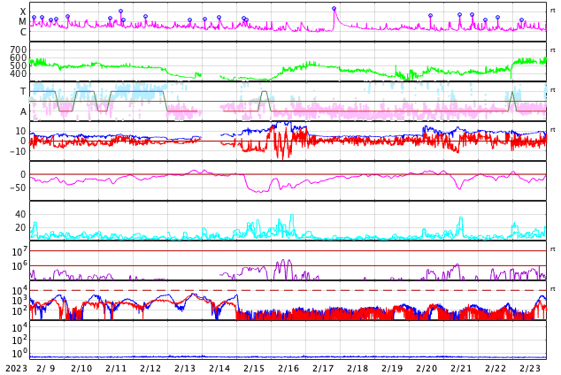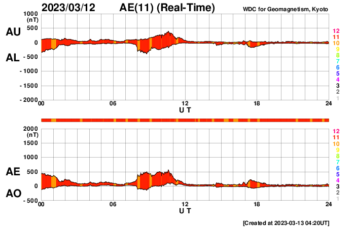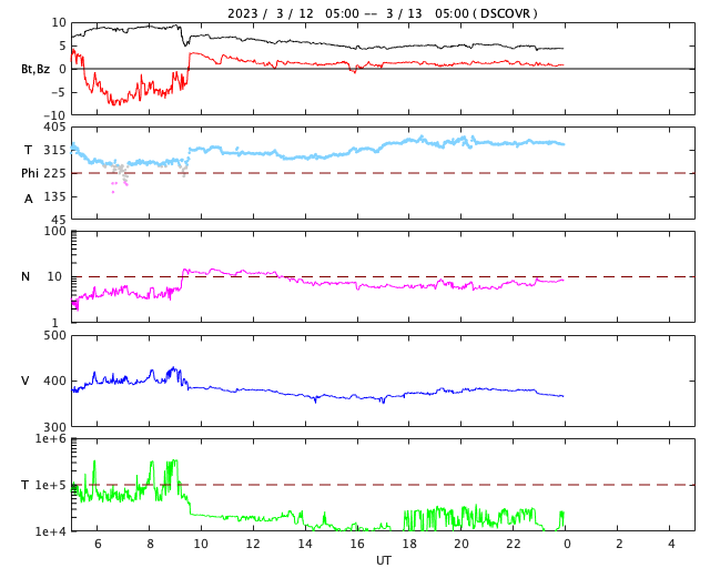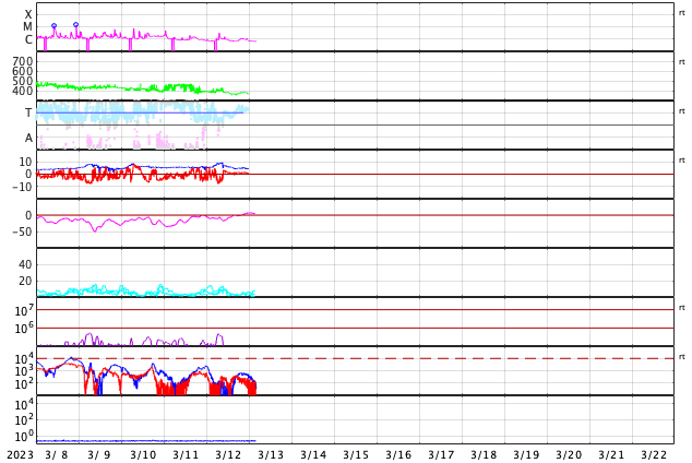 2023/ 3/13 13:24 更新 太陽で噴出が続いています。太陽風はやや低速です。 担当 篠原 昨日の昼、12日11時(世界時12日2時)頃に、 太陽の北東の端(左上)でプロミネンスの噴出が発生しています。 GOES衛星SUVI 304の動画を掲載します。 SOHO衛星LASCO C2、C3では、 太陽の左上に飛び出すCME(コロナ質量放出)が観測されています。 地球に対して横向きの噴出なので、影響はないでしょう。 そして、今日未明、13日3時(世界時12日18時)頃には、 太陽の南東側(左下)でフィラメント噴出が発生しています。 SDO衛星AIA193の動画を掲載します。 CMEの様子を、 STEREO Ahead衛星COR2の動画で紹介します。 この衛星は地球よりも少し左側から太陽を観測しています。 CMEは、太陽の下側を中心に飛び出しています。 地球方向は、弱い影響に留まりそうです。 太陽のフレアは、中心部南側の3253群で、 C3.2の小規模フレアが発生した程度です。 3日連続で噴出の動画を紹介しています。 フレアの発生は少なくなっていますが、 太陽では様々な現象が発生しています。 太陽風は、370km/秒とやや低速になっています。 グラフの最後でデータが途切れていますが、 現在は350km/秒くらいまで下がっている様です。 磁場強度は、一時的に9nTに強まる変化が発生していますが、 以降は5nTと平均的な状態が続いています。 磁場の南北成分は、グラフの中盤以降は弱い北寄りで、 磁気圏は穏やかです。 AE指数も中盤以降は変化が見られなくなっています。