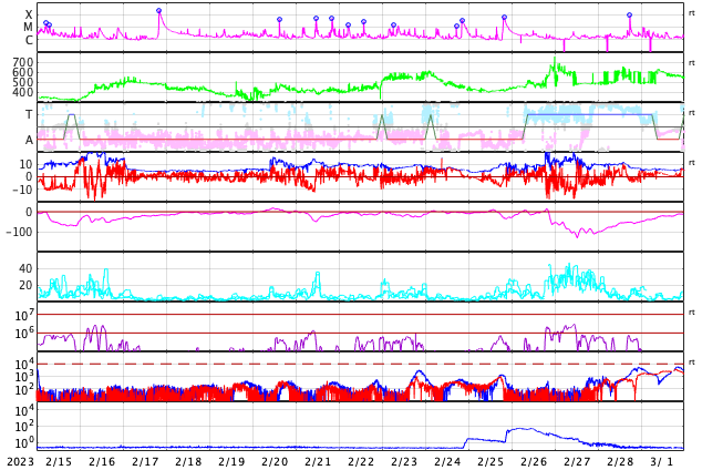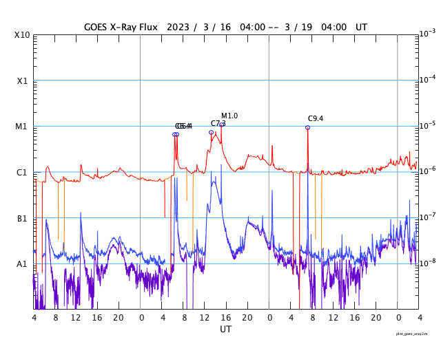 GOES衛星の太陽X線強度。赤・橙 = 0.1〜0.8 nm、青・紫 = 0.05〜0.4 nm (c) データ:NOAA/SWPC、作図:宇宙天気ニュース ![]() | ||||||||||||||||||||||||||||||||||||||||||||||||||||||||||||||||||||||||||||||||||||||||||||||||||||||||||||||||||||||||||||||||||||||||||||||||||||||||||||||||||||||||||||||||||||||||||||||||||||||||||||||||||||||||||||||||||||||||||
