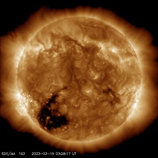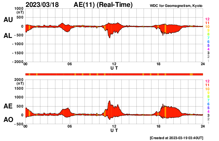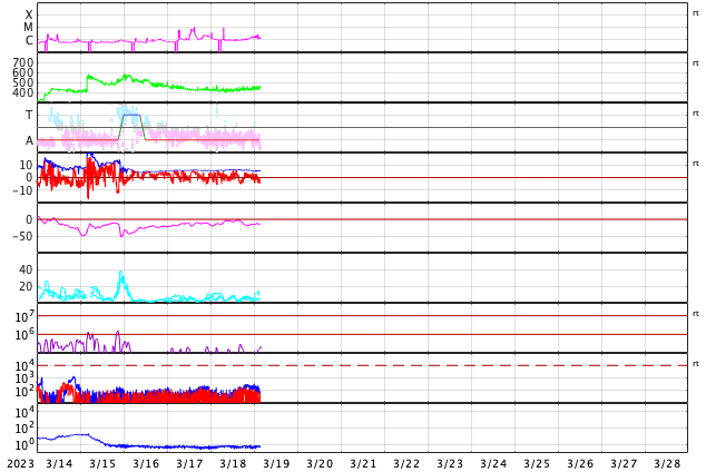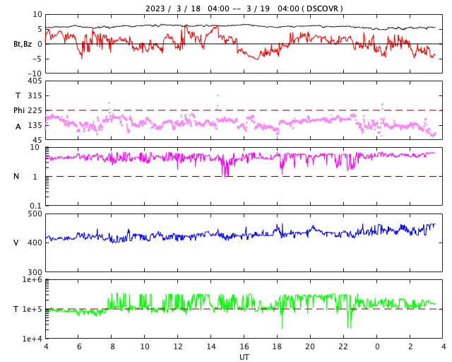 2023/ 3/19 12:41 更新 太陽風は平均的な状態です。磁気圏の活動は時々強まっています。 担当 篠原 太陽風の速度は、 420km/秒から450km/秒へ少し上がっています。 磁場強度は、5〜6nTで安定しています。 どちらも平均的な状態です。 磁場の南北成分は、 北寄りになったり、南寄りになったり、 ゆっくり変化する状態が続いています。 磁気圏の活動も、 強まったり、静かになったりとなっていて、 AE指数は、飛び飛びで500nT前後の 中規模の変化が発生しています。 SDO衛星AIA193では、 南東側(左下)のコロナホールが目立っています。 明日くらいに太陽の中心線に達して、 その3日後くらいから太陽風の速度が高まるかもしれません。 太陽は、南東の端近くの3256黒点群で C9.4とMクラス寸前の小規模フレアが発生しています。 3256群とその左下の3257群では、 C1〜2の小さい小規模フレアが頻繁に発生しています。 変化が大きくなるようであれば、注意が必要になるでしょう。 また、北東の端(左上)に新しい黒点が現れています。 この後、どの様な活動を起こすでしょうか。